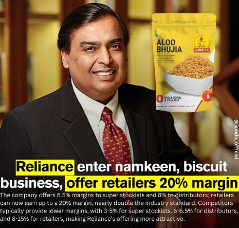 Reliance to offer 20% margin to retailers for namkeen and biscuit business, doubling industry standard.