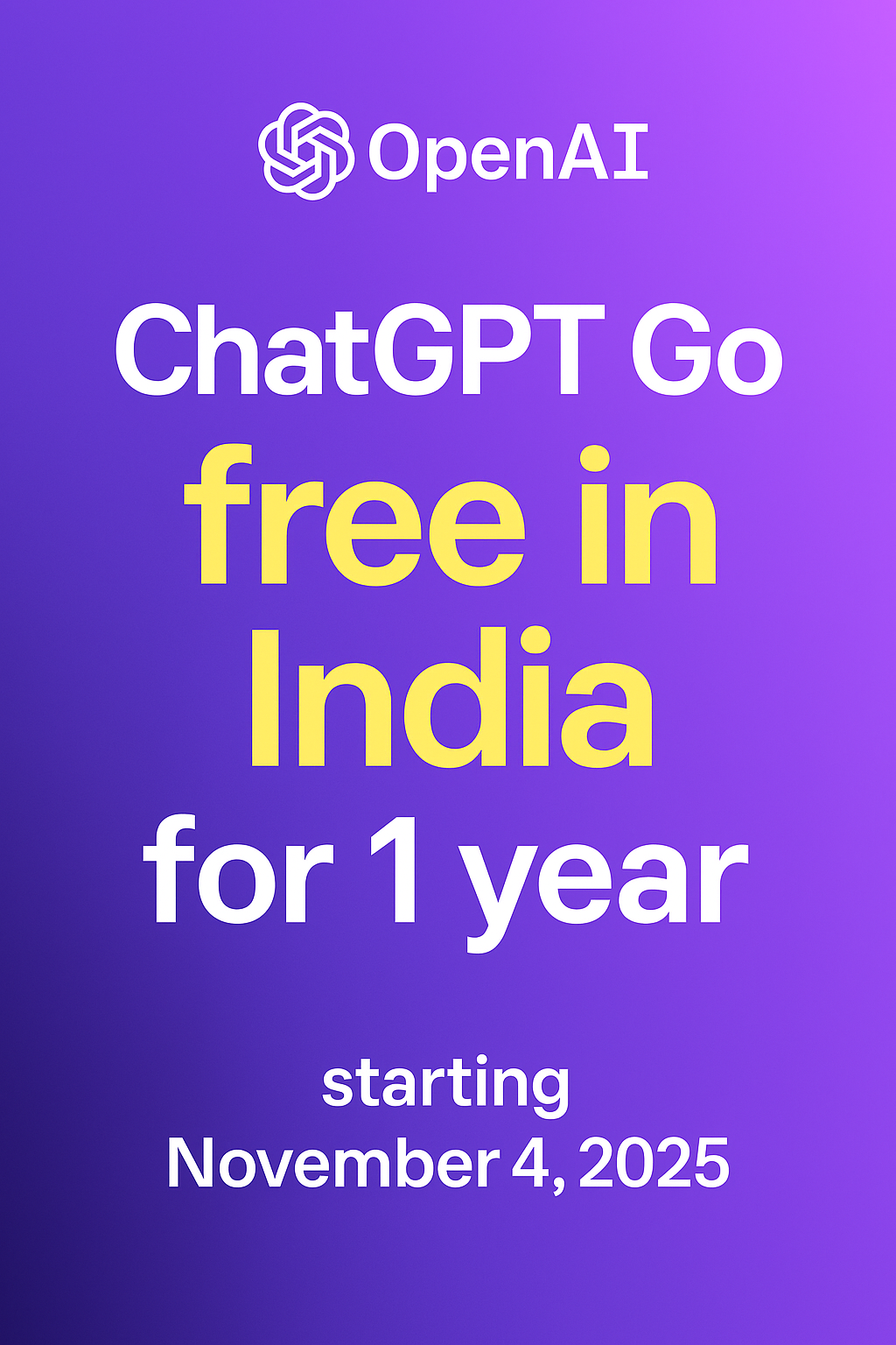 ๐ **Big news for India!** ๐ฎ๐ณ OpenAI is now offering **ChatGPT Go โ completely free** for all users in India. ๐ฌโจ This move opens up AI access to millions of students, creators, professionals, and small business owners who can now experience the po