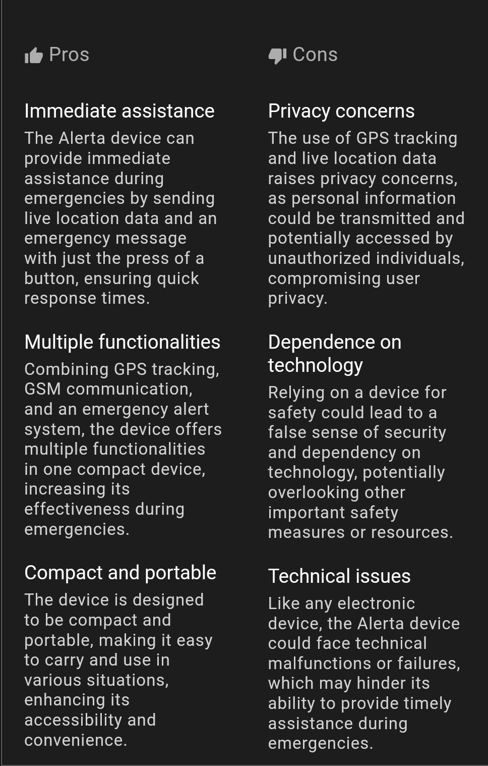 Analyzing the Pros and Cons of Alerta: A Compact Emergency Assistance Device for Women's Safety. While it offers immediate help with live tracking and multiple functionalities, concerns about privacy, dependence on technology, and potential technical