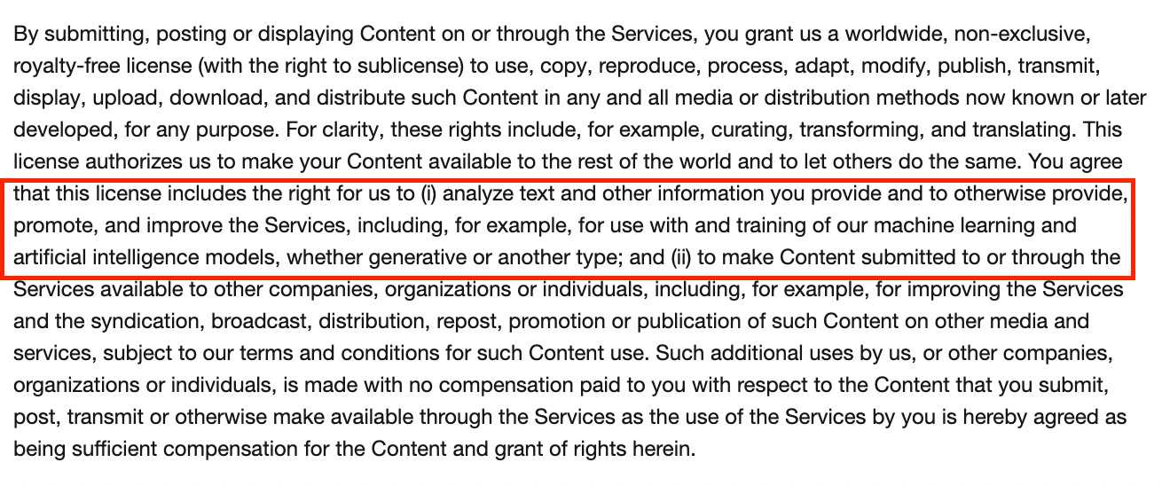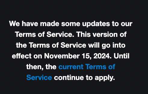 X has a new terms of service that goes into effect on November 15. It says that by using the service you agree that everything you post can be used to train their AI models.
