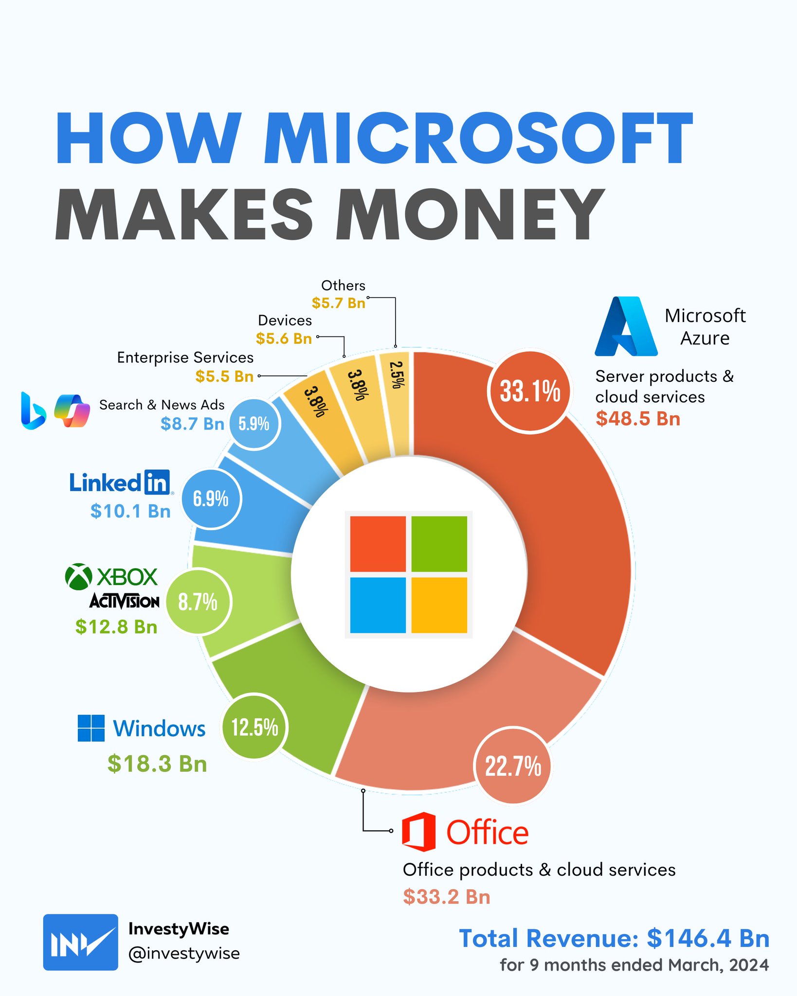 "Ever wondered how🚀 Microsoft makes its 💰💰money? Here's a breakdown from their Q1 FY24 earnings. With $56.5 billion in revenue, the key areas driving growth are Productivity & Business Processes, Intelligent Cloud, and More Personal Computing. The