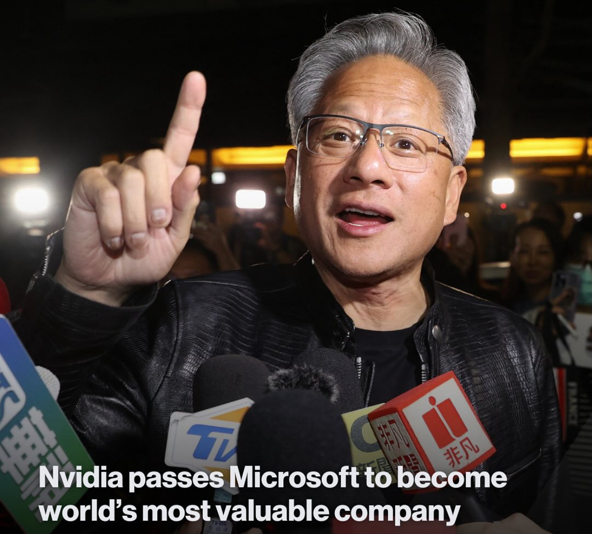 The Al boom has crowned a new number one. Nvidia shares rose 3.5% today, helping the Al chip leader pass Microsoft as the world's most valuable company. Its surge over the last year and a half is hard to fathom. Since the end of October 2022, when