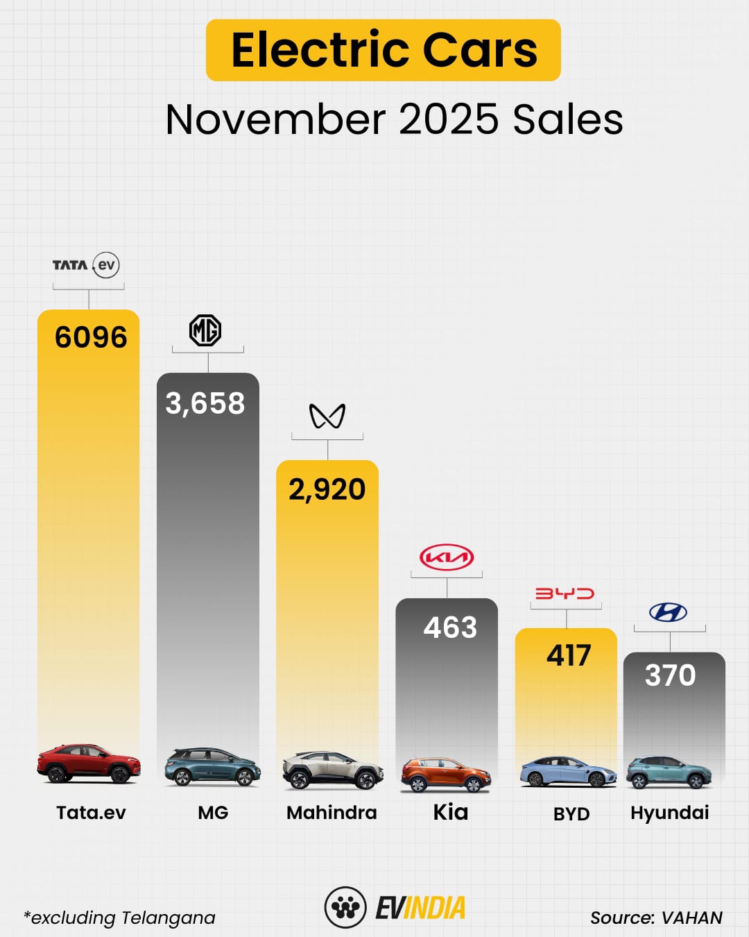 ๐ง๐ฎ๐๐ฎ.๐ฒ๐ is still the clear No.1 in Indiaโs EV race. November sales dipped after festive highs, but the big names remain on top. MG and Mahindra keep their podium spots as BYD steadily grows mindshare. Any bets for next month? Whatโs your predi