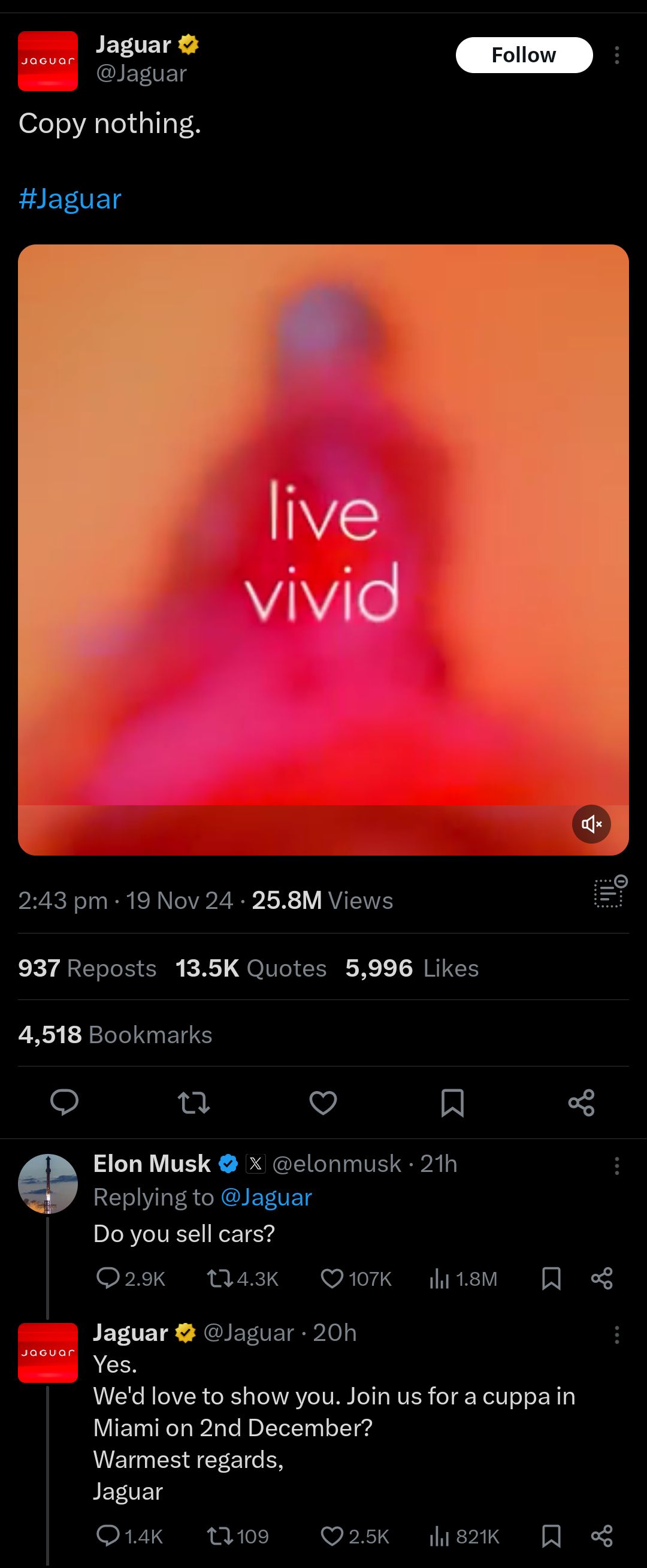 Jagaur had revealed the new logo of his brand on X, to which Elon Musk asked, “Do you sell cars?” Jagaur replied, “Yes. We would love to show you. Join us for a cuppa in Miami on December 2nd.”