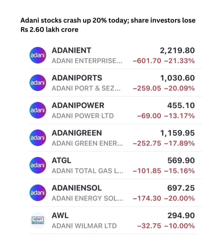 "Adani Group Loses ₹2.2 Lakh Crore in Market Cap as Stocks Drop 20% Amid US Bribery Allegations" "Adani Enterprises Leads Market Crash with 22.6% Drop; Adani Energy Solutions and Adani Green Energy Follow Suit" Adani Group's listed companies experi