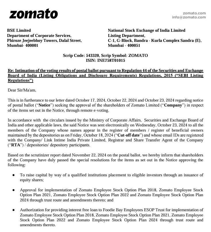 Zomato's shareholders have approved the plan to Rs 8,500 crore through a QIP. 99.8% of the shareholders have voted in favour of the fundraise.They have also approved setting up an ESOP trust and giving an interest-free loan to the trust.