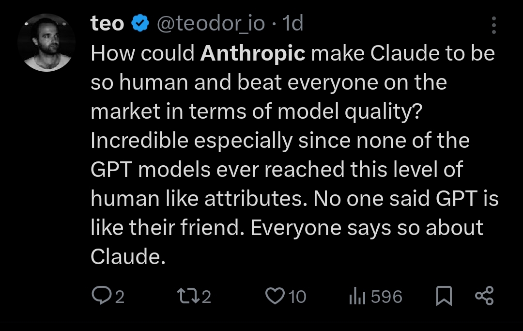 Keep thinking about the influence of behavioural science in AI. People beginning to prefer anthropic over chatgpt because of the way it's able to communicate is the perfect perfect example.