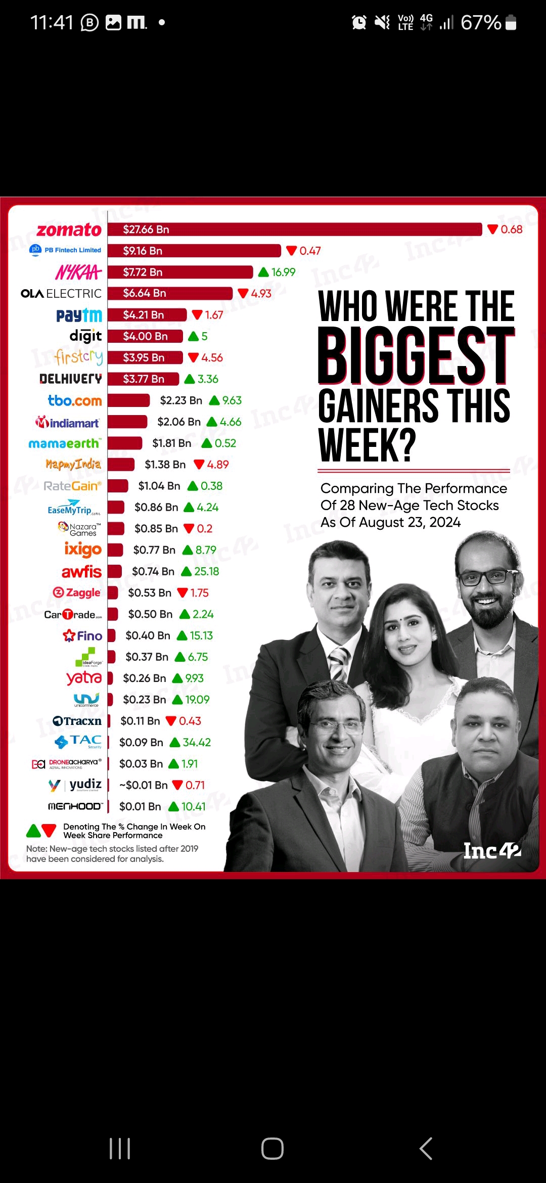 Here are the key points about the new-age tech stock market: *Gainers:* 1. TAC Infosec: +34.42% to an all-time high of INR 773.90 2. Unicommerce: significant gains as a recently listed SaaS startup 3. Awfis: gains as a coworking startup 4. TBO Tek: