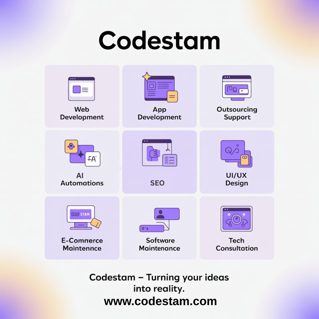 At Codestam, we bring together everything your business needs in one place ,from web & app development to AI automations, API integrations, e-commerce, SEO, and beyond. Because turning your ideas into reality shouldn’t be complicated ,it should be s