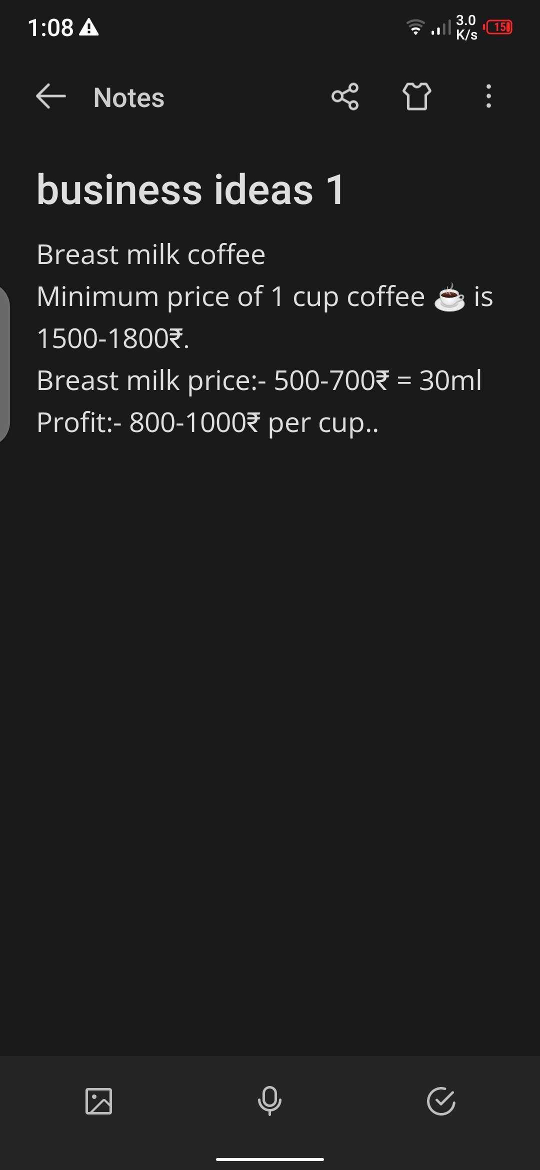 Breast milk coffee Minimum price of 1 cup coffee ☕ is 1500-1800₹. Breast milk price:- 500-700₹ = 30ml Profit:- 800-1000₹ per cup..