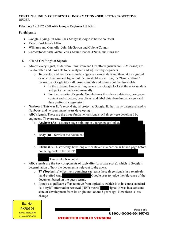New evidence released in the Google Antitrust case โwith fresh details about how Google's Algo works "February 18, 2025 Call with Google Engineer H.J Kim" is a doozy... The ABCs of ranking: (A)nchors (B)ody (C)licks ๐ You should probably read the