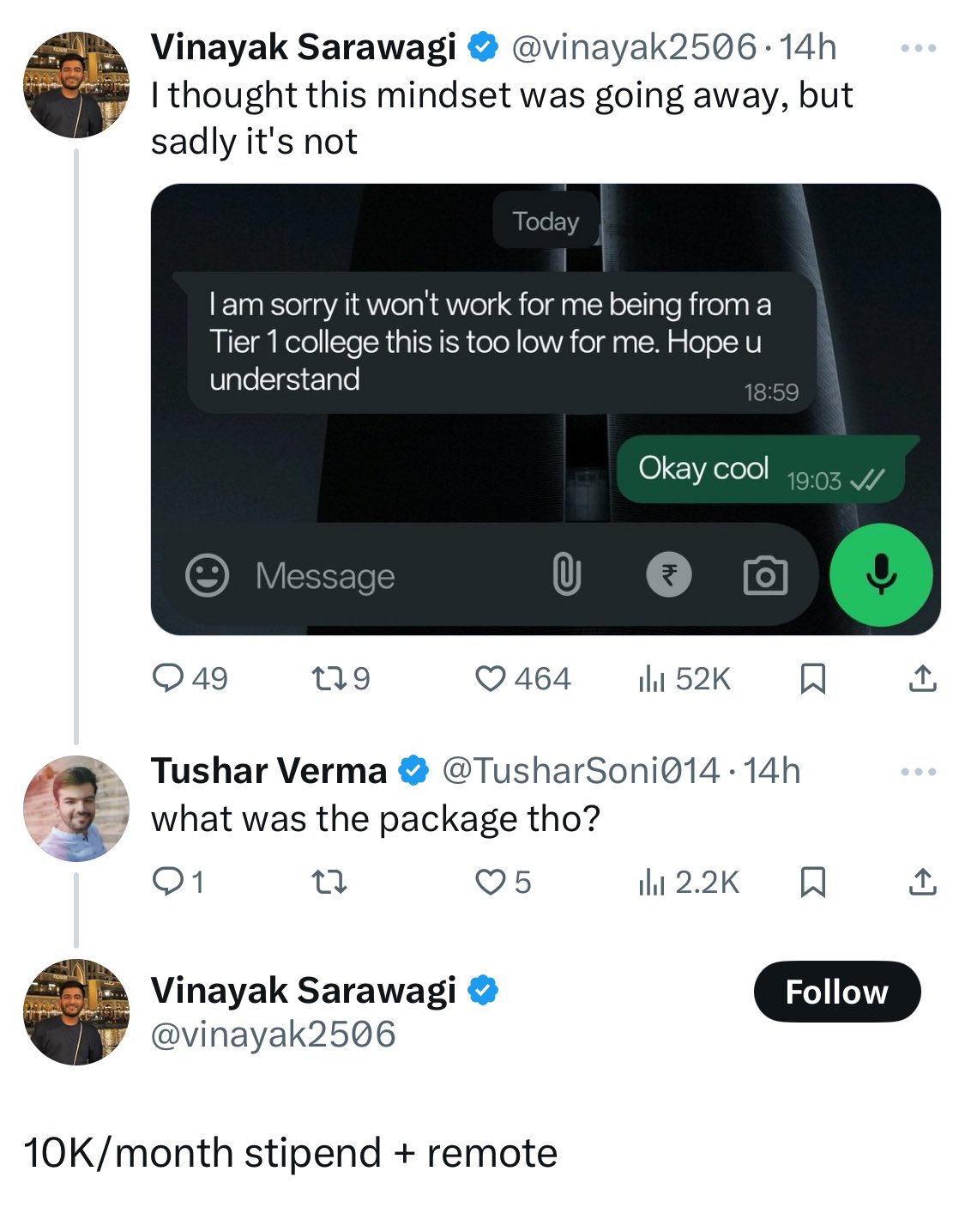 Founder gets sad when someone from a tier-1 college refuses to join at 10,000โน per month. Zamindaari nahi jaayegi is desh se.