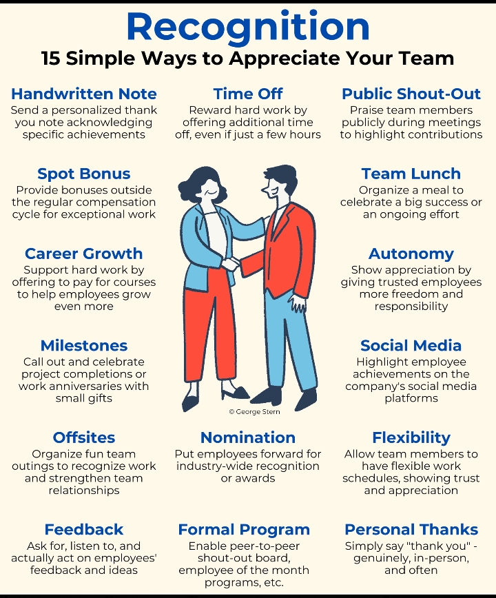 "A person who feels appreciated will always do more than what is expected." Recognition is a tremendously underrated leadership skill. Here are 15 ways leaders can better recognize their team members: