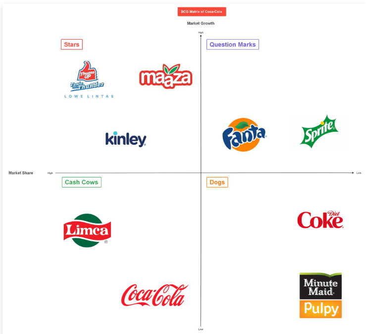 BCG Growth Matrix is a framework for analyzing a company's product portfolio. There are 4 quadrants, each of which represents a particular product or business, the vertical axis represents market growth (cash generation) and the horizontal axis repr