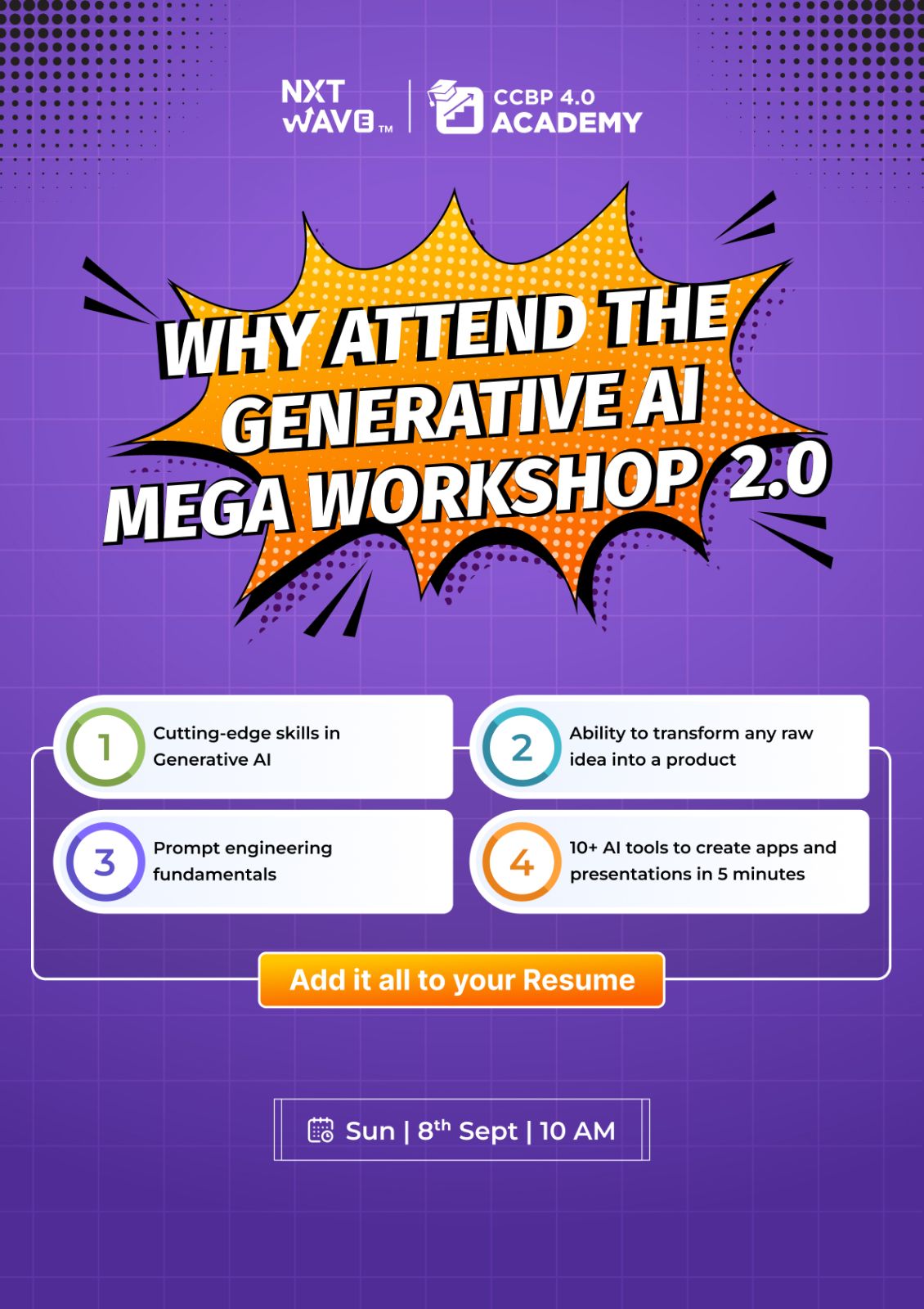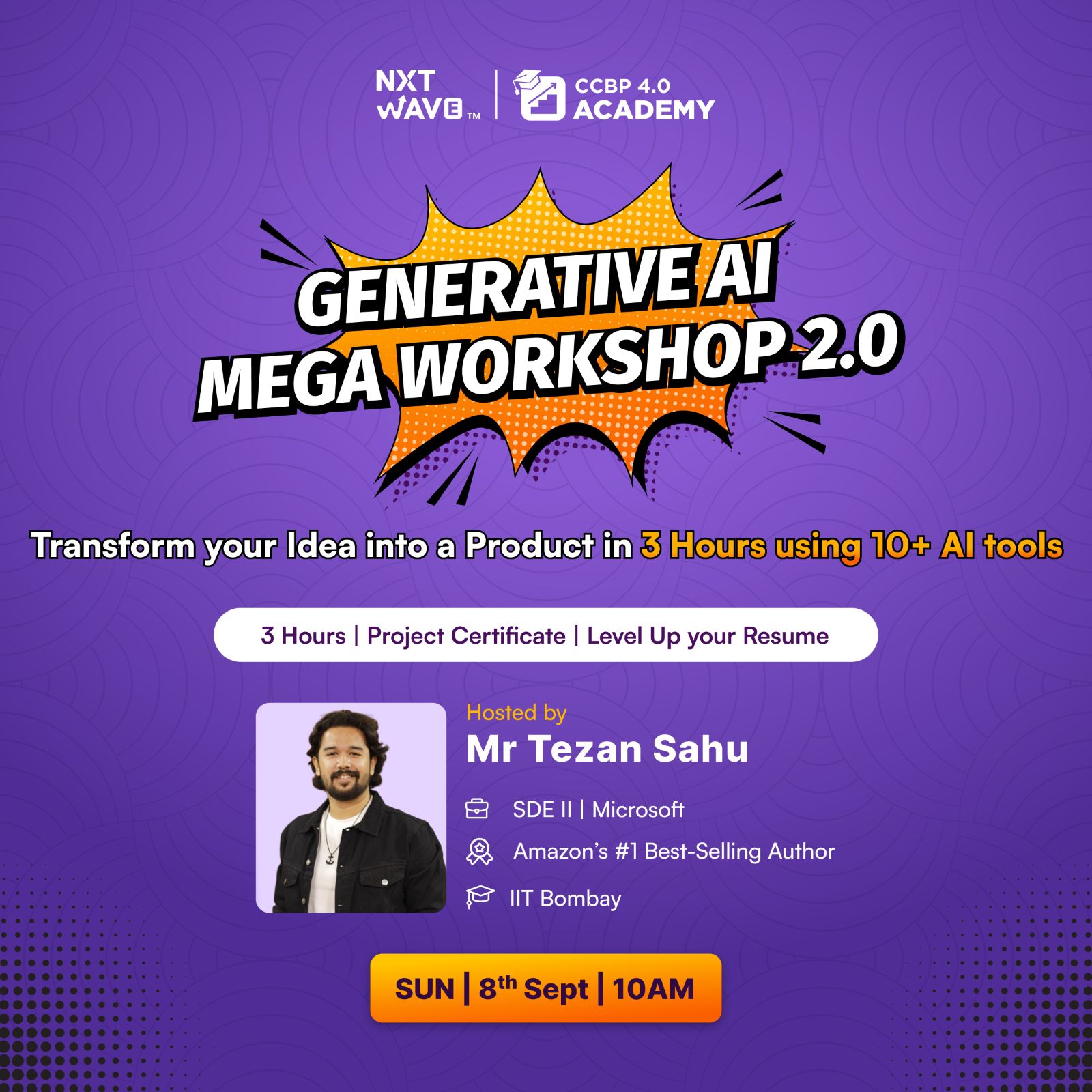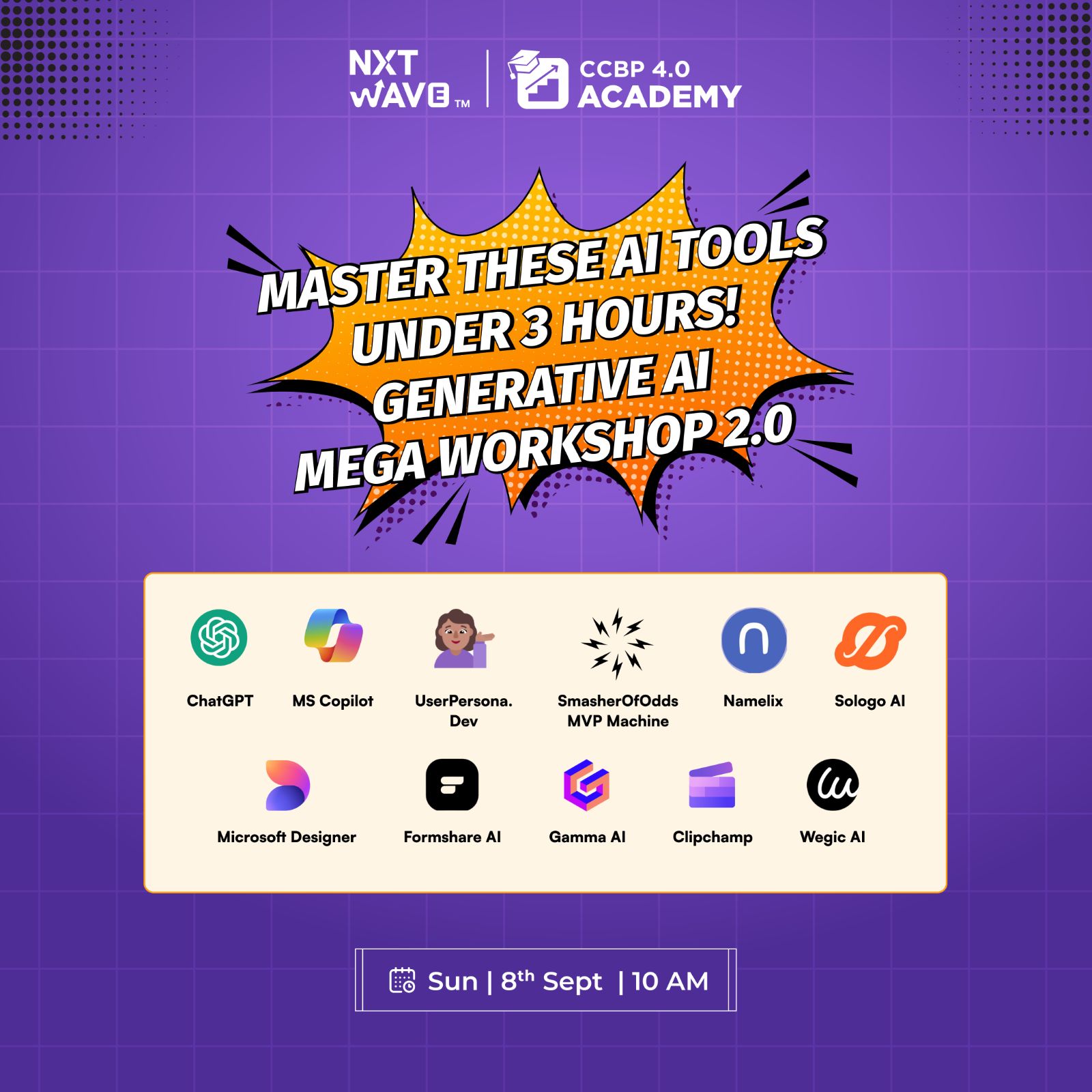 Generative AI Mega Workshop 2.0: ๐ Excited to share that I've started attending the Generative AI Mega Workshop 2.0! ๐ Hosted by NxtWave CCBP 4.0 Academy, this immersive workshop is equipping me with hands-on skills using 10+ AI tools like ChatGP