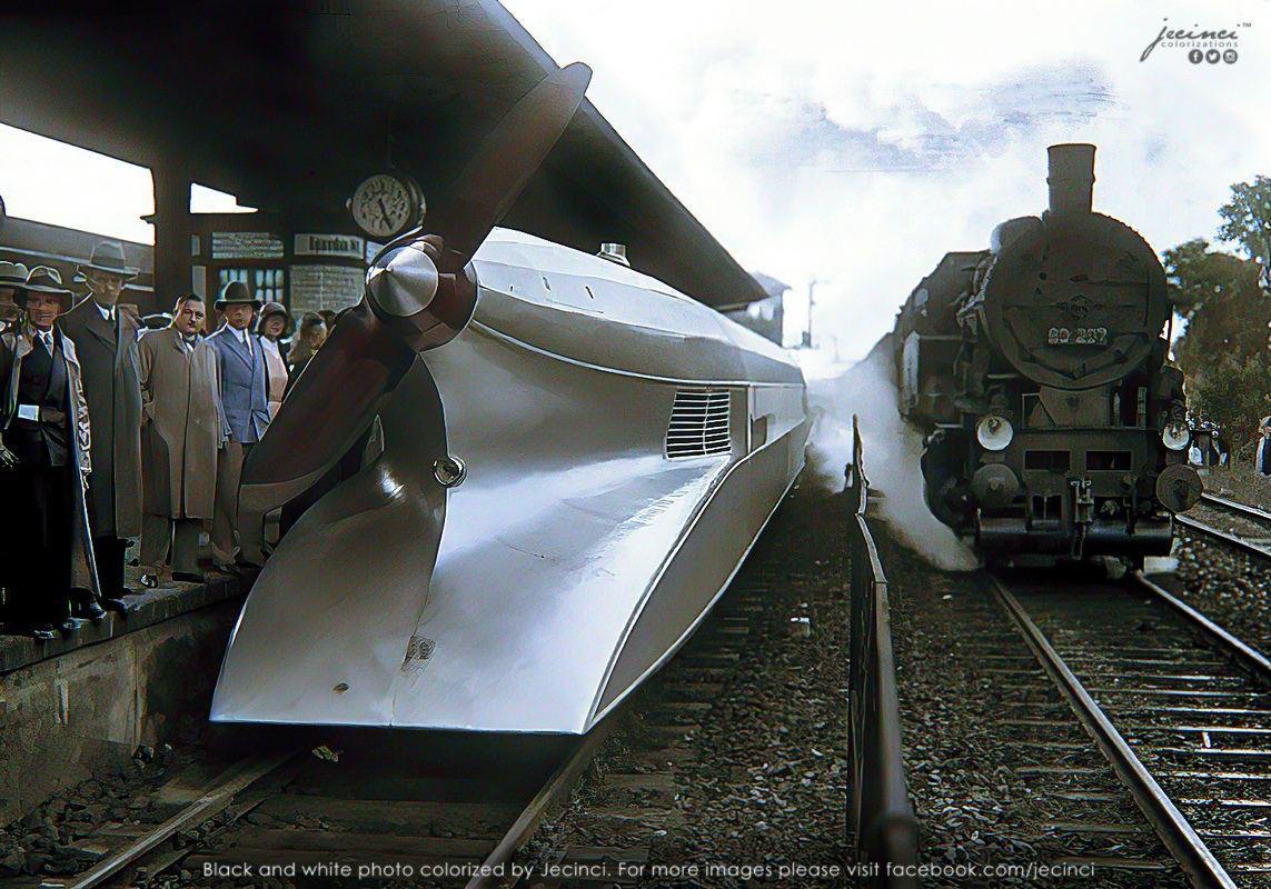 Rail zeppelin and steam-powered train near railroad platform. Germany, 1931