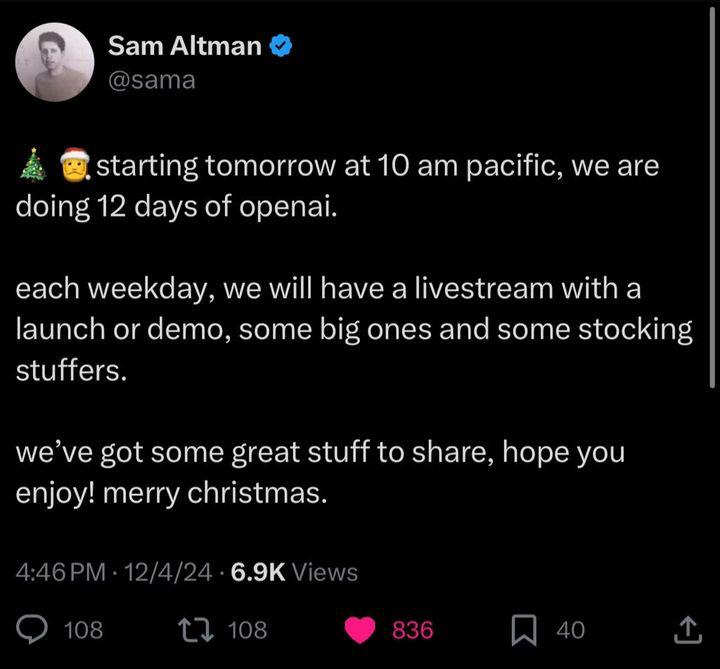 OpenAI announced 12 days of OpenAI when they will be releasing / announcing one feature at a time accompanied with a live demo. Christmas came earlier than planned! 👀