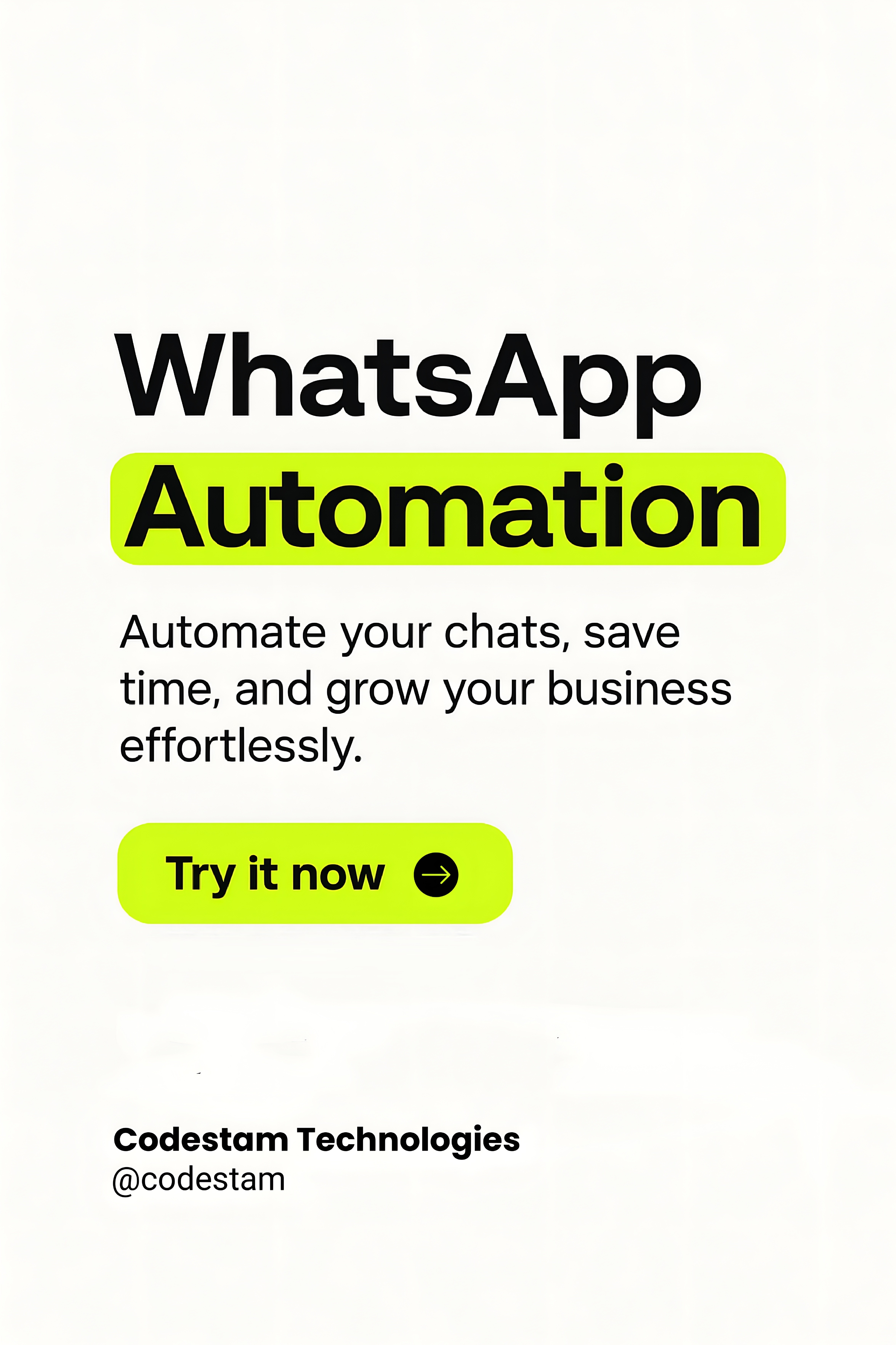 Save time, automate chats, and grow faster with WhatsApp Automation by Codestam Technologies. Simplify your customer communication and boost productivity effortlessly. Try it now. . . . . #WhatsAppAutomation #BusinessGrowth #AutomationTools #SmallBus