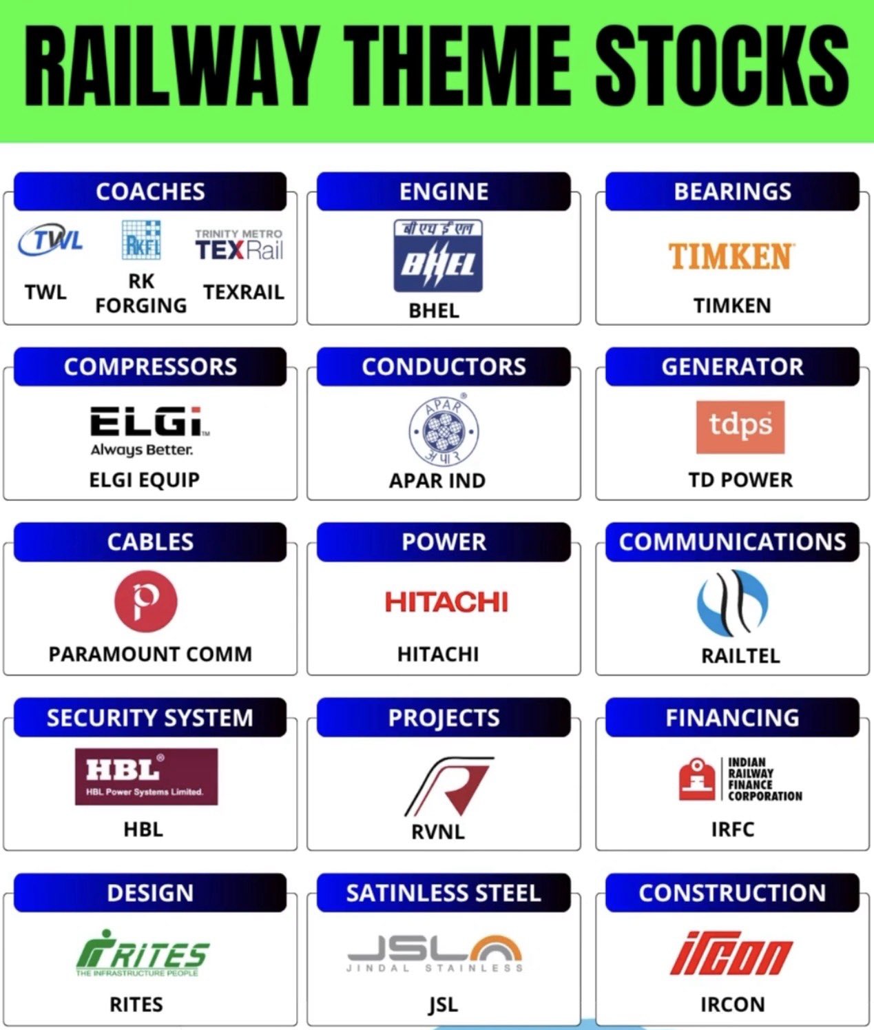 Top Railway Theme Stocks You Shouldn’t Miss! From coaches to construction ,these companies are driving India’s railway revolution! 📊 Sectors Covered: 🔹 Coaches – TWL, RK Forging, Texrail 🔹 Engine – BHEL 🔹 Bearings – Timken 🔹 Power, Communica