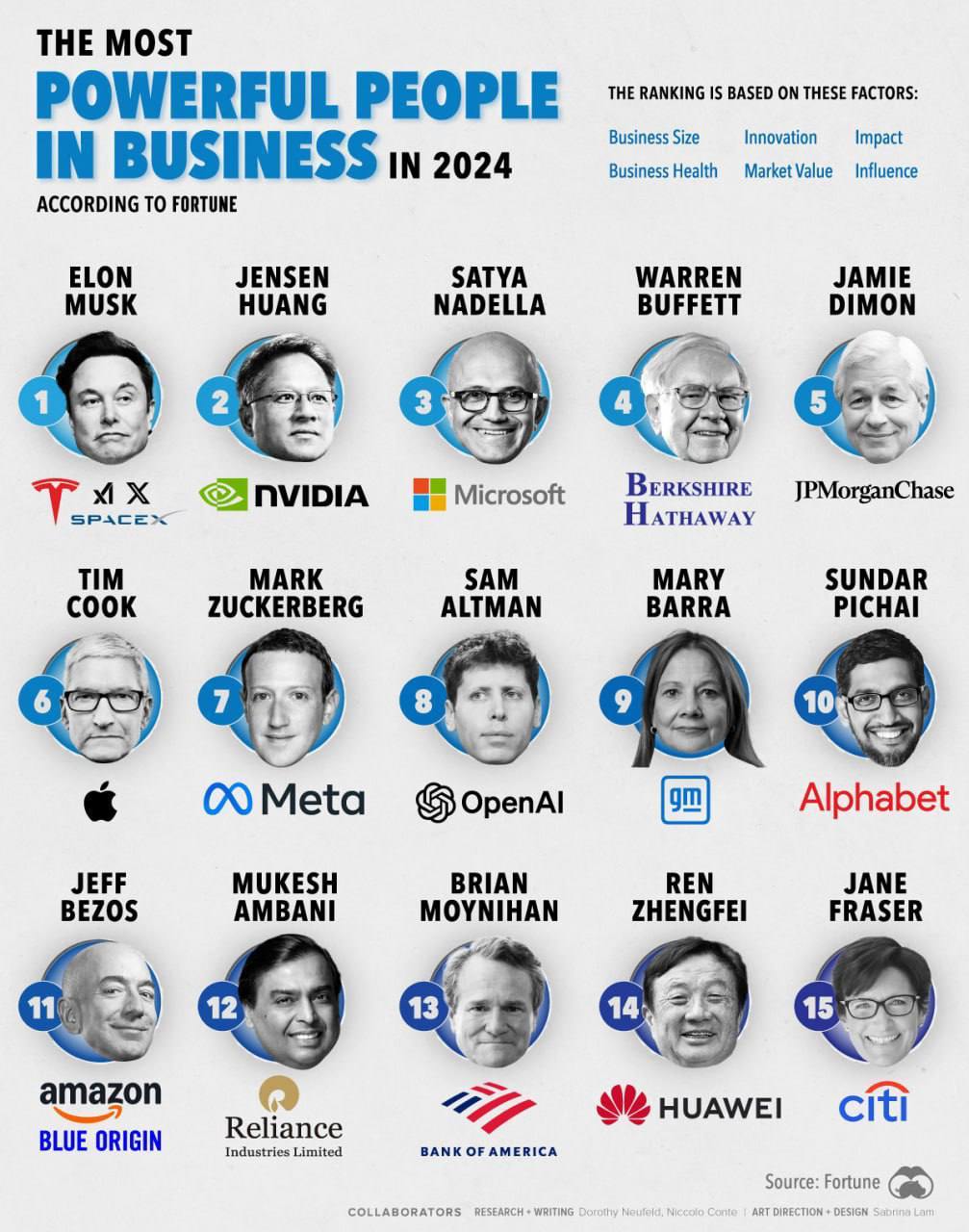 ๐ฃ The most influential entrepreneurs in the world in 2024. ๐ Top three โ 1. Elon Musk 2. Jensen Huang 3. Satya Nadella