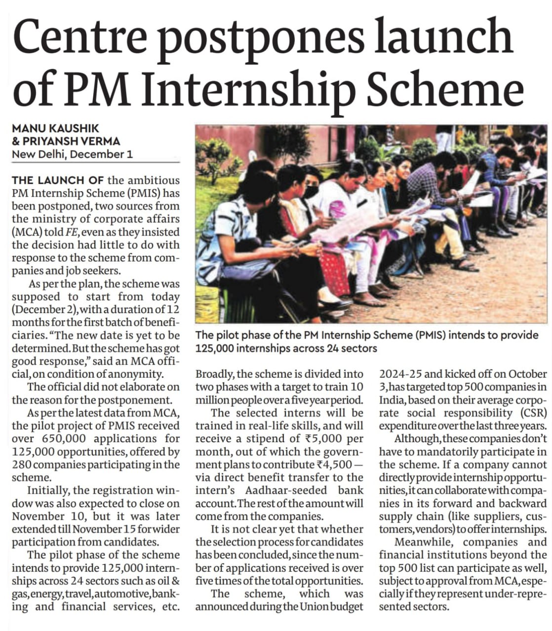 🚀 The Internship scheme bthat was to be launched (2nd Dec) has been postponed, with no new date announced. 🤯 The Govt received 6,50,000 applications for 1,25,000 opportunities, offered by 280 companies. (FE) 🇮🇳