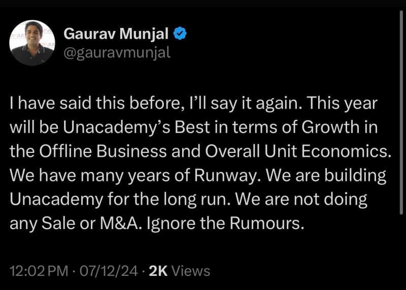 🚨 Big Breaking news: Unacademy is not selling to Allen Gaurav Munjal has dismissed the rumours. Ekdum se waqt badal diya jajbaat badal diya zindagi badal di 😂🤣