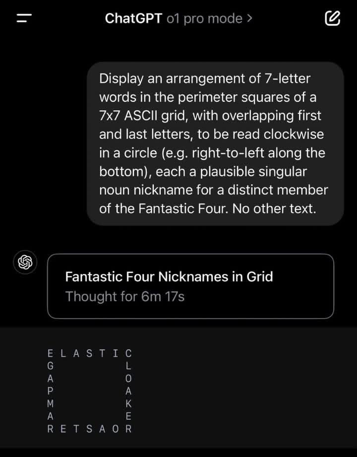 ChatGPT o1 pro creates a frame of partially overlapping 7-letter words, readable clockwise in a circle, each a plausible singular noun nickname for a member of the Fantastic Four op: goodside on 𝕏
