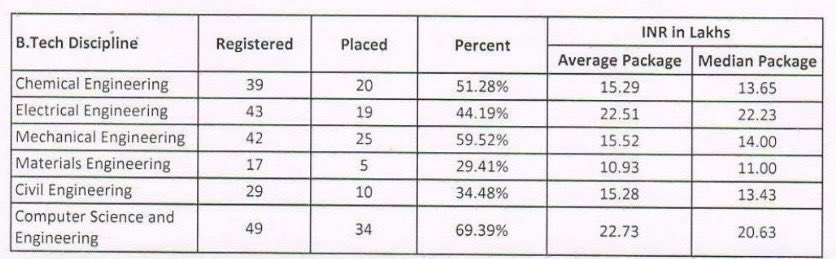 Placement stats for IIT Gandhinagar Two things that surprised me. I - Percentage of folks placed are too low. Even Comp Science is below 70%. In lower departments like Civil / Materials, 2 out of 3 are not placed. 2 - Median salary for electric