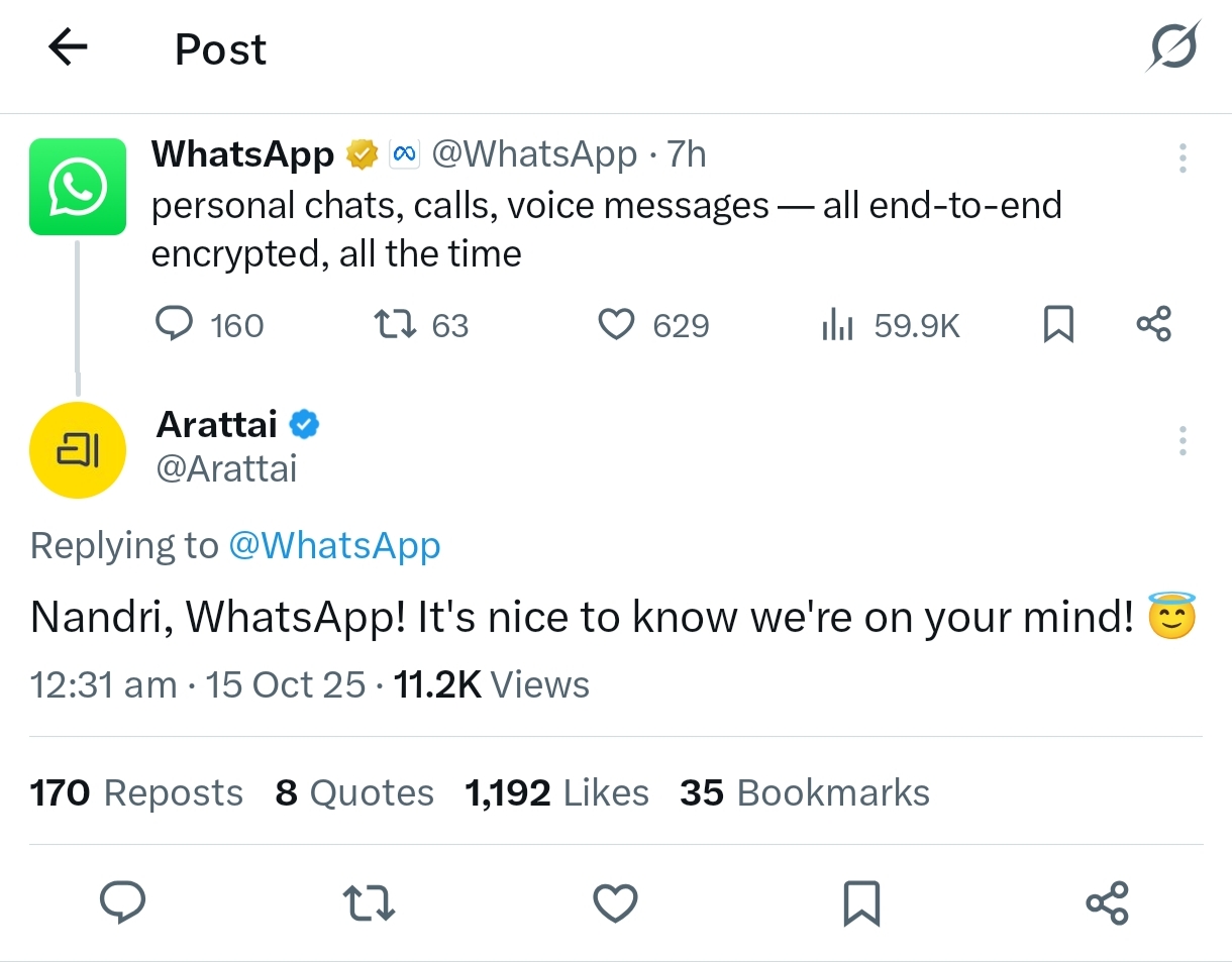 Looks like **WhatsApp** sensed the growing heat 🔥 — suddenly reminding everyone that *“personal chats, calls, voice messages are end-to-end encrypted.”* But this move speaks louder than the message itself. When global giants start **reaffirming the