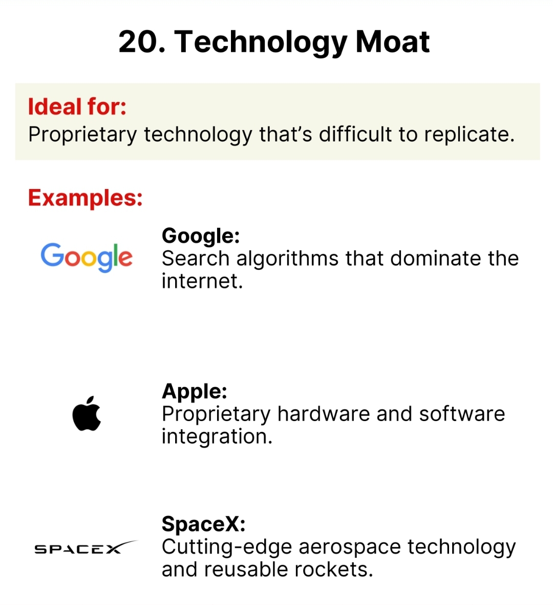 🚀 Technology Moat: The ultimate competitive edge! 💡 Google’s powerful search algorithms, Apple’s seamless hardware-software integration and SpaceX’s groundbreaking reusable rockets make them nearly impossible to replicate. 🔥 Innovation at its fine