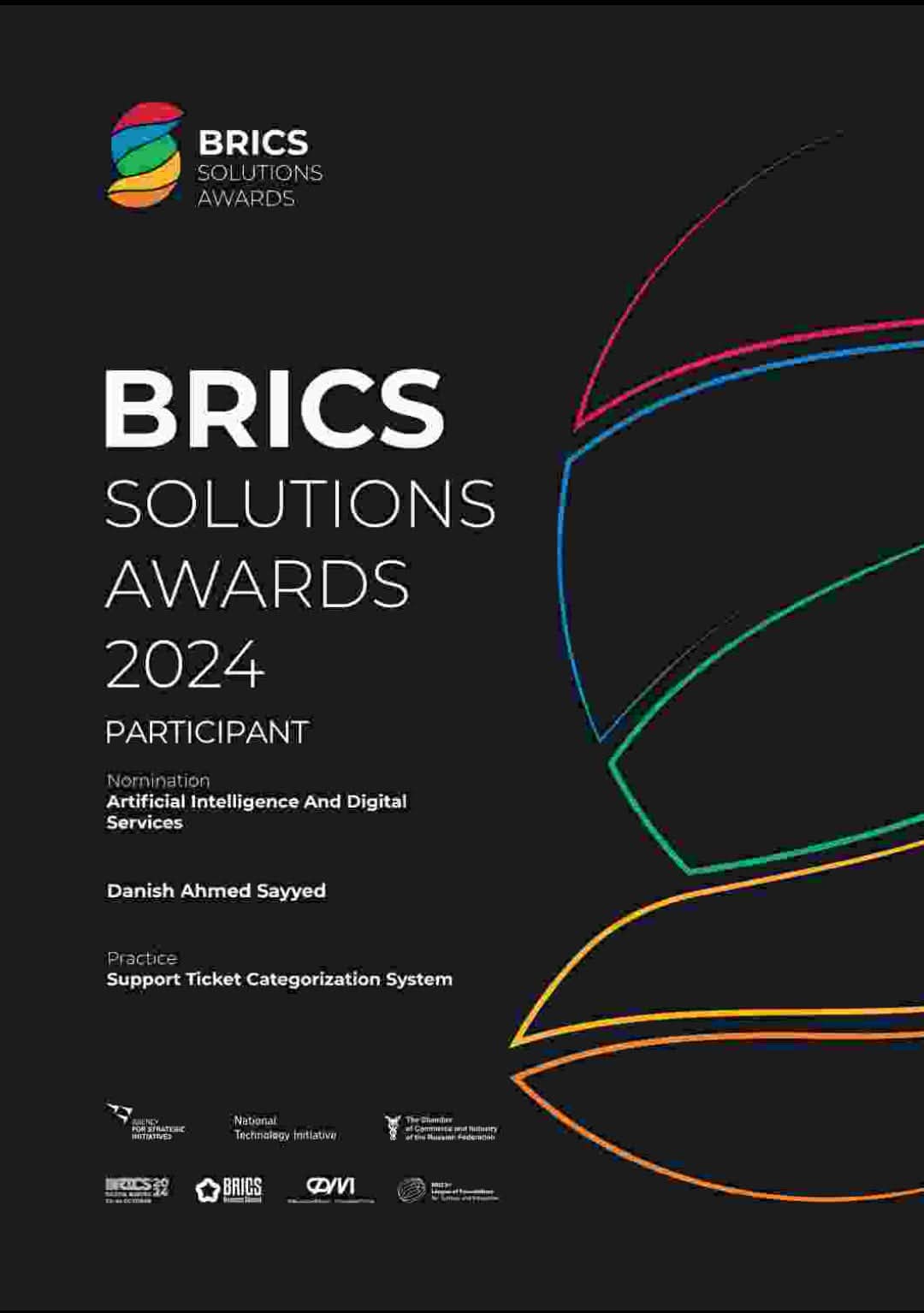 Hi All, I am honored to be a participant in the BRICS Solutions Awards 2024 for my research in Artificial Intelligence and Digital Services. My project "Support Ticket Categorization System" is recognized for driving innovation in customer support. Feeling proud to contribute to the development of the joint technological vision! Thank you Dmitry Bridzhe and the BRICS Solutions Awards team for this recognition, i am grateful for the opportunity. #BRICS2024 #BRICSSolutionsAwards #AI #Innovation