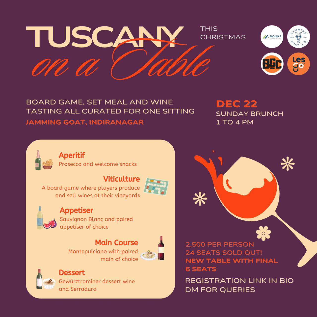 Our next fun meetup is here! ๐๐ท Join us this Christmas season on 22nd Dec, 1-4 PM for Tuscany on a Table! Indulge in a delightful wine-tasting session, a set meal brunch at Jamming Goat, Indiranagar, and experience the joy of playing the award-winning board game, Viticulture. ๐ฒโจ ๐ P.S. Donโt forget to dress in your Christmas best! Click here to book your spot: https://tally.so/r/waBZNB