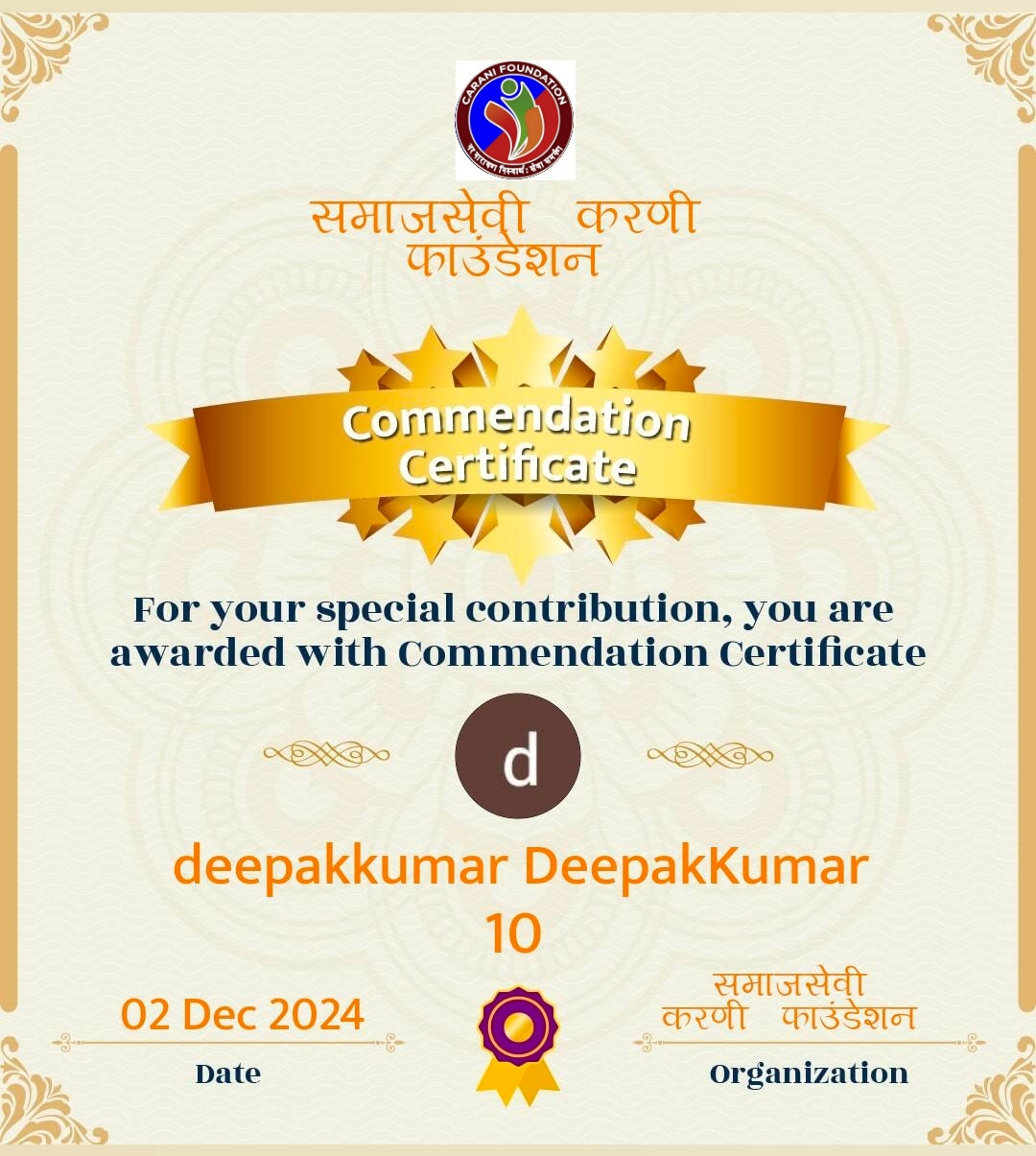 दीपक कुमार जी ने (1 दिसंबर) को बहुत अच्छा कार्य किया, उन्हें उनके योगदान के लिए इस डिजिटल प्रमाणपत्र से सम्मानित किया जा रहा है। "इनके उत्कृष्ट कार्य के लिए यह सर्टिफिकेट प्रदान किया जाता है। फाउंडेशन इनके उज्जवल भविष्य की कामना करती है और आशा करती ह