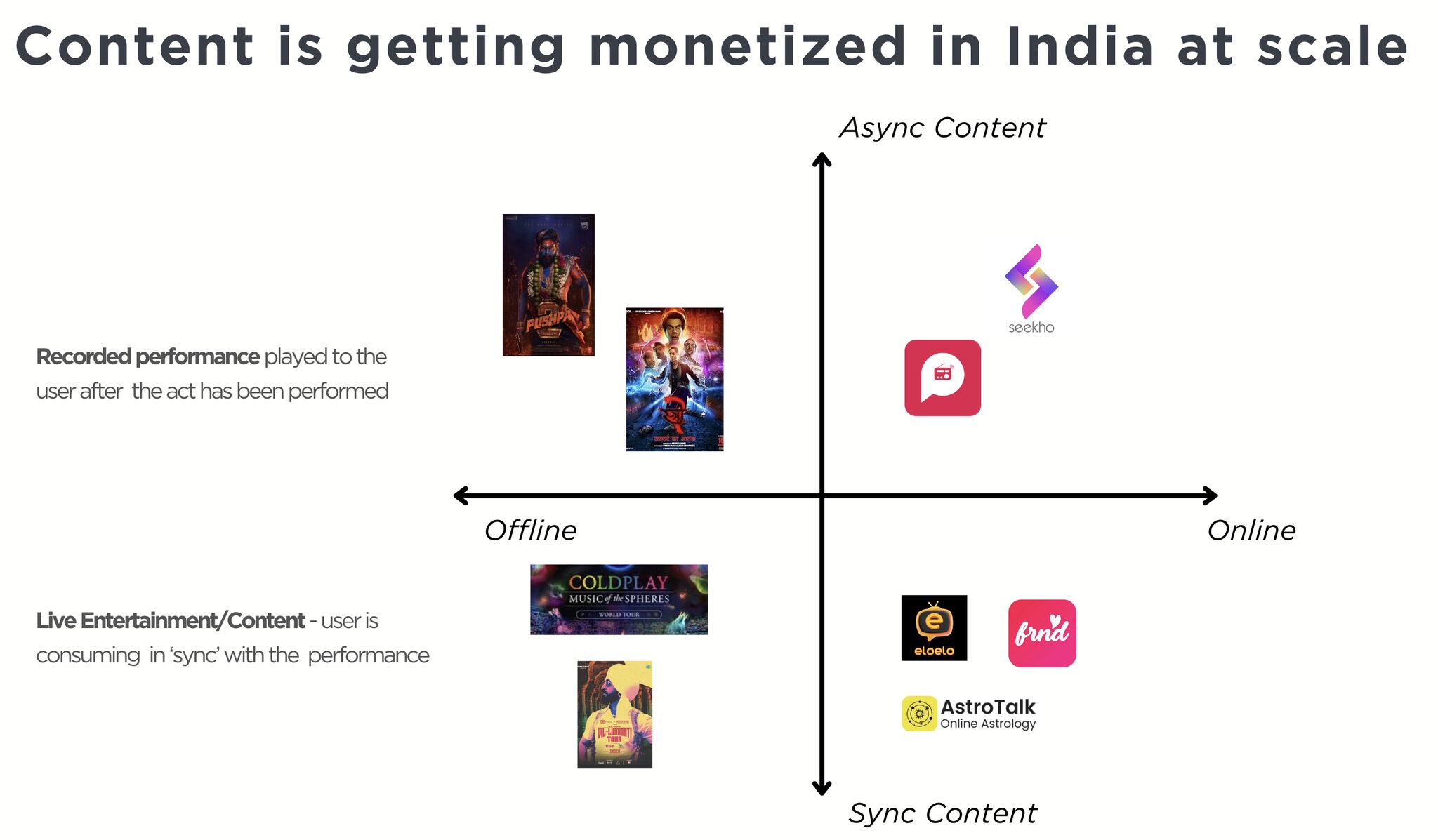 🎭 Content Monetization 2.0: India's Not Just About DAUs Anymore Offline is still king but make it premium 👑 Pushpa casually dropping $180M shows Indians will pay big for theatrical experiences. Coldplay selling out concerts = premium offline experiences are the new flex Online-Sync is the dark horse 🐎 AstroTalk quietly building an $85M revenue machine through live consultations Virtual gifting becoming the new normal (looking at you, Eloelo) Live social apps proving Indians will pay for connection, not just content The Rise of Micro-payments 💸 Pocket FM converting storytelling into a $20M business shows the power of bite-sized payments at scale The "Pay-for-Experience" shift 📈 Moving from "everything free" to "premium for quality" Both online/offline worlds seeing this transition Sync/Async split shows different monetization strategies working simultaneously Key insight: India's graduating from the "DAU farm" era. The real game is just beginning, and it's all about monetization innovation across formats. (source: linkedin)