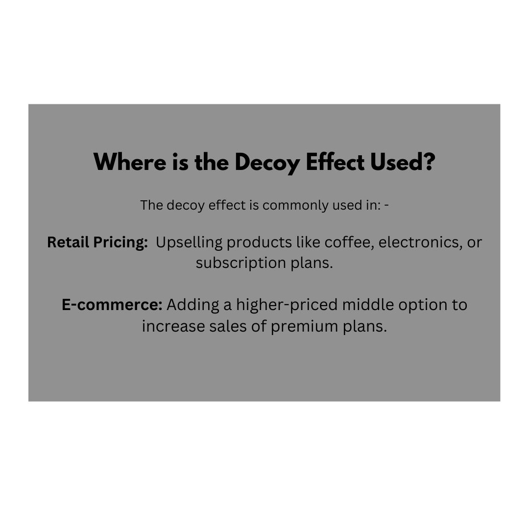 “The Decoy Effect: How Brands Trick You into Choosing More” The Decoy Effect is a pricing strategy where businesses introduce a third, less attractive option (the “decoy”) to subtly push customers toward a more profitable choice. It plays on human p