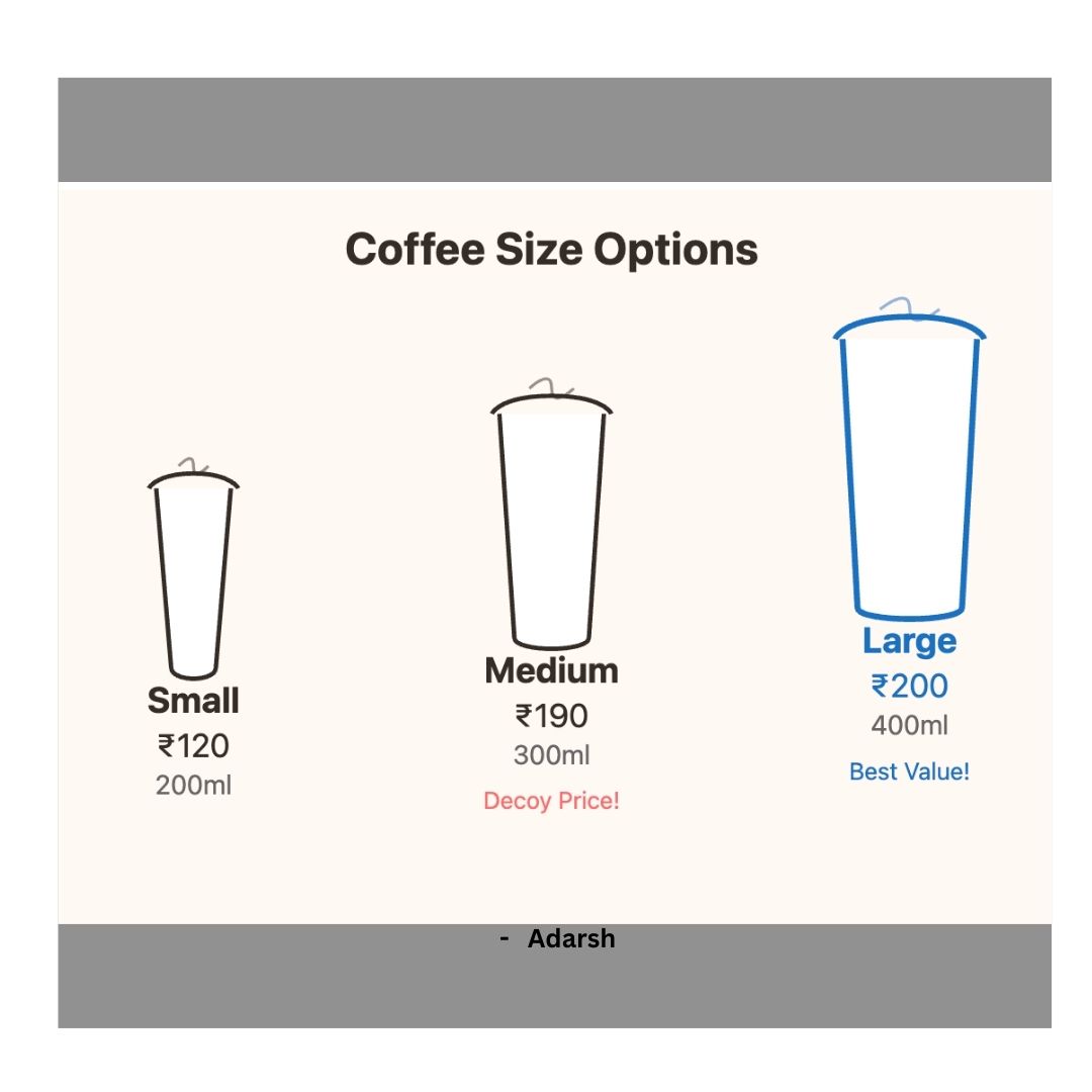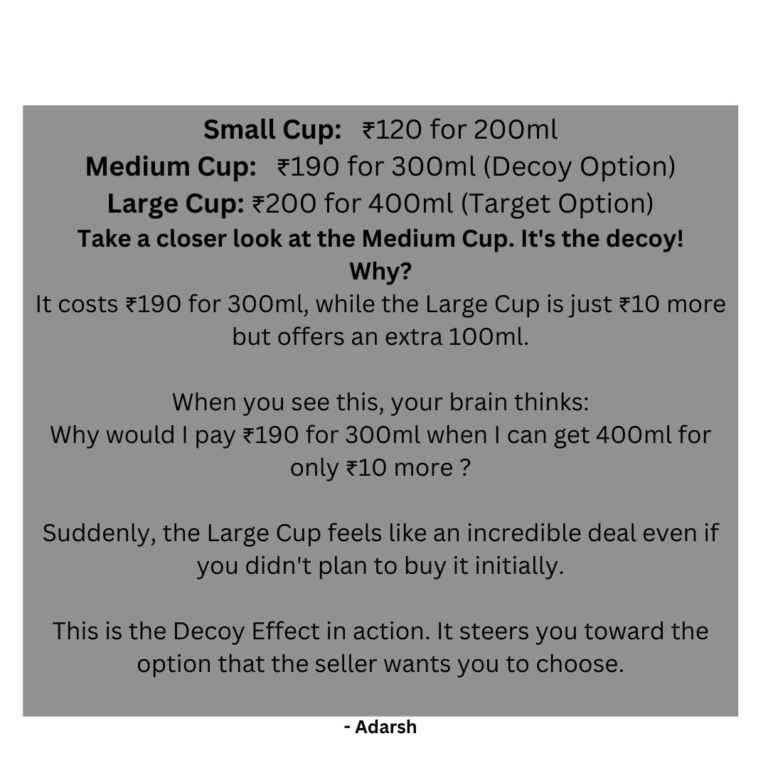 Ever wondered why you end up buying the “medium” popcorn at the theatre instead of the small one? That’s the Decoy Effect at work—a pricing illusion so sneaky it makes you think you’re choosing wisely. Businesses add a third “decoy” option just to pu
