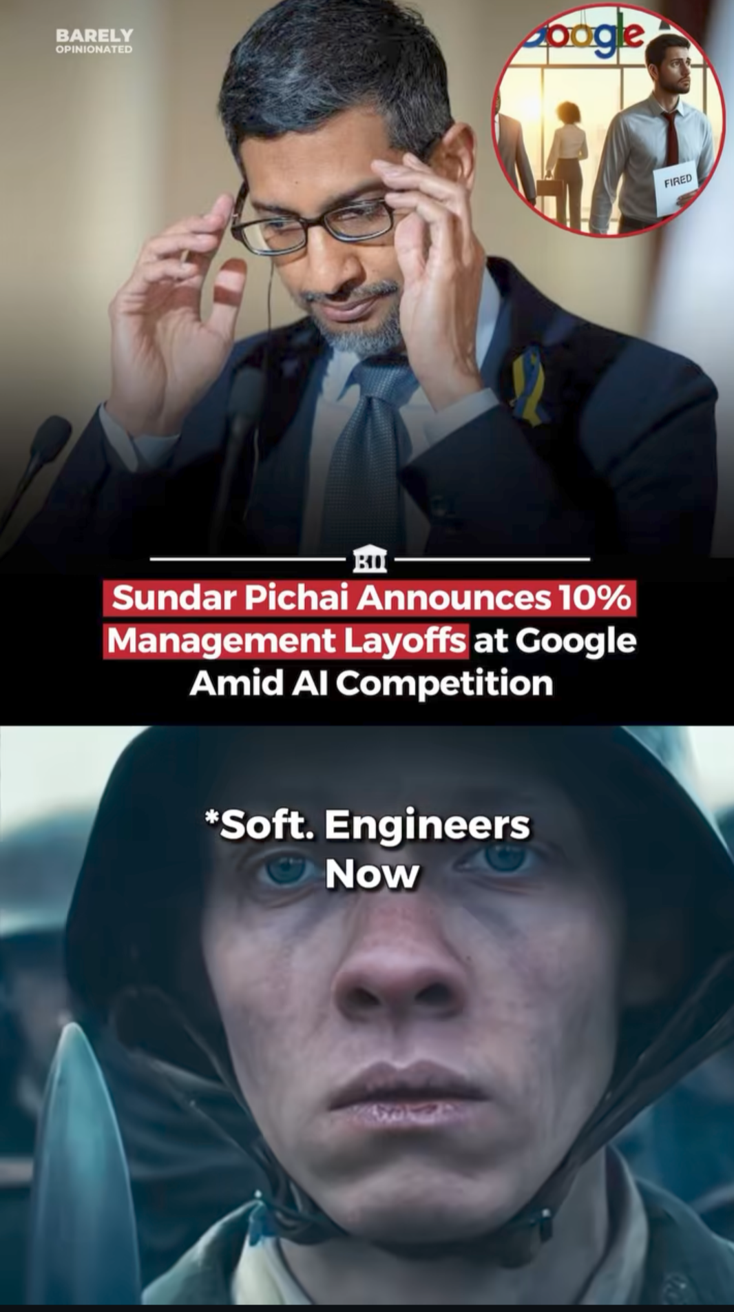 Sundar Pichai, the CEO of Google, has announced that the company will be laying off 10% of its management staff. This comes amid increasing competition from other AI companies, such as ChatGPT. Pichai said that the layoffs are necessary to "streamline" the company and "focus on our priorities." Here is some additional information that you might find interesting: * Google is not the only tech company to have announced layoffs recently. Amazon, Microsoft, and Meta have all also announced plans to lay off employees. * The layoffs at Google are expected to affect about 12,000 employees. * Pichai said that the company will be providing severance packages and other support to the employees who are laid off. * Some analysts believe that the layoffs at Google are a sign that the company is struggling to compete with other AI companies. * Others believe that the layoffs are a necessary step for Google to remain competitive in the AI market. I hope this helps!