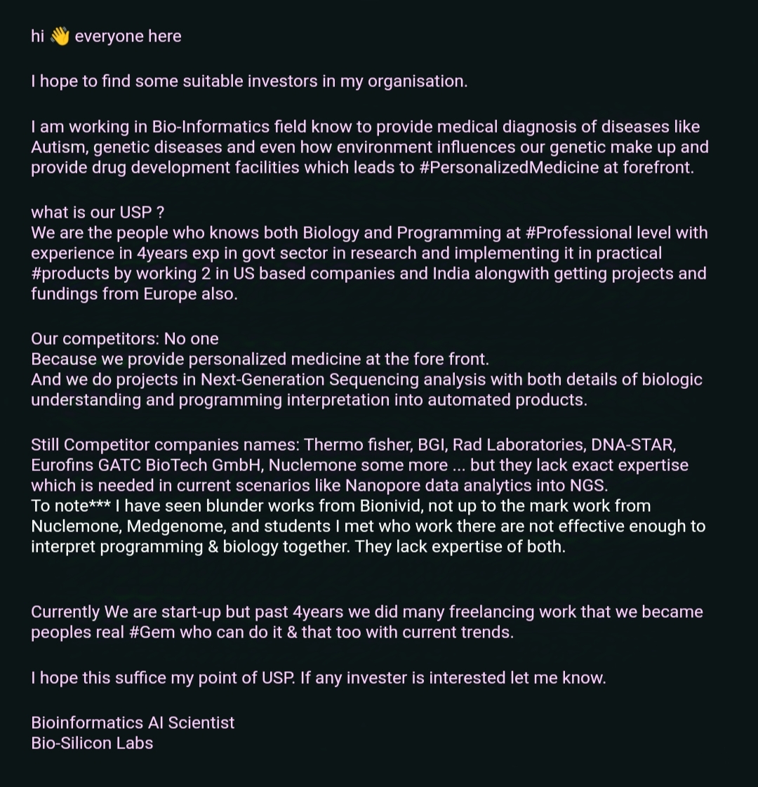 hi 👋 everyone here I hope to find some suitable investors in my organisation. We provide medical diagnosis of diseases like Autism, genetic diseases and even how environment influences our genetic make up and provide drug development facilities which leads to #PersonalizedMedicine at forefront. what is our USP ? #Professional level with experience in 4years exp in govt sector in research and implementing it in practical #products by working 2 in US based companies and India alongwith getting projects and fundings from Europe also. Our competitors: No one Because we provide personalized medicine at the fore front. #For more details on competitors to name some & other details, please go through attached image. Currently We are start-up but past 4years we did many freelancing work that we became peoples real #Gem who can do it & that too with current trends. Bioinformatics AI Scientist Bio-Silicon Labs