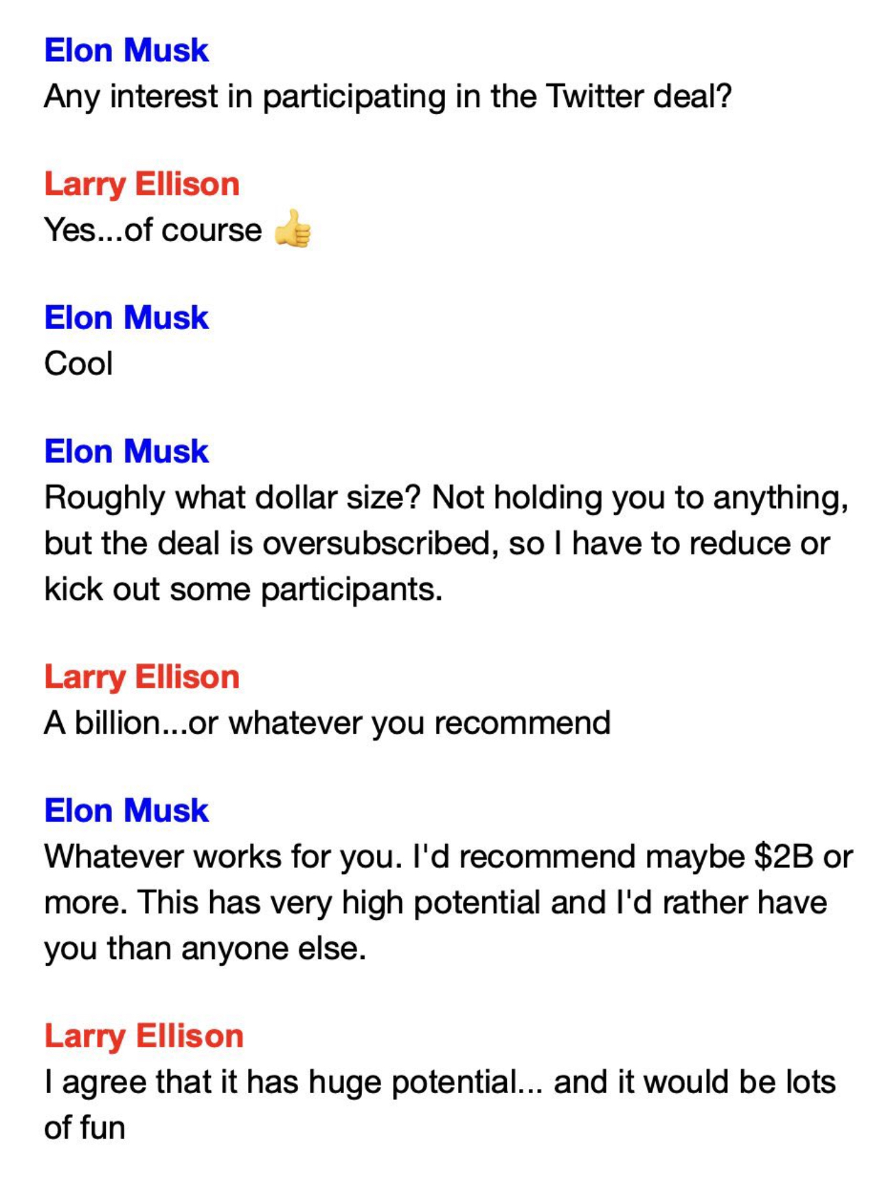Conversation between Elon Musk and Larry Ellison on investing in Twitter