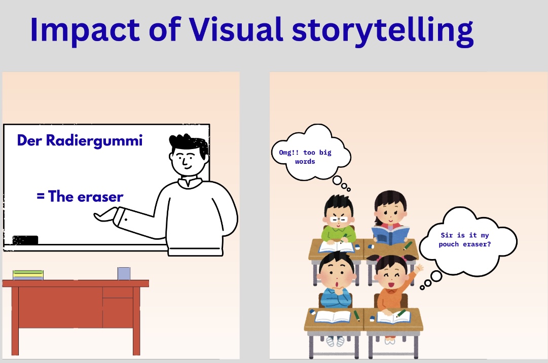 Do you see the power of visual storytelling? 💪 A vocabulary word of German language has been broken down with a visual, which eventually helped the kid imagine the meaning of the word 😇 Every person has its own meaning of the word and visual stor