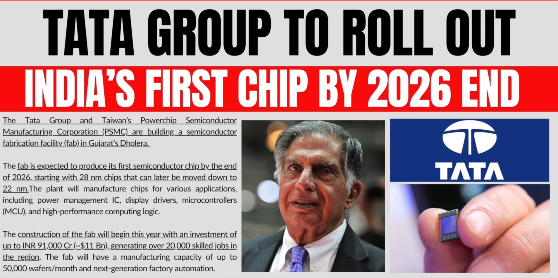 Wooh 🚀 ! Great news that Tata Group will rollout India's First Chip by 2026, Basically it is on 28 NM Fabrication Process but in the future it will become 22 NM Chips according to Business Standard. As we see , In India firstly started Assembly, Ma