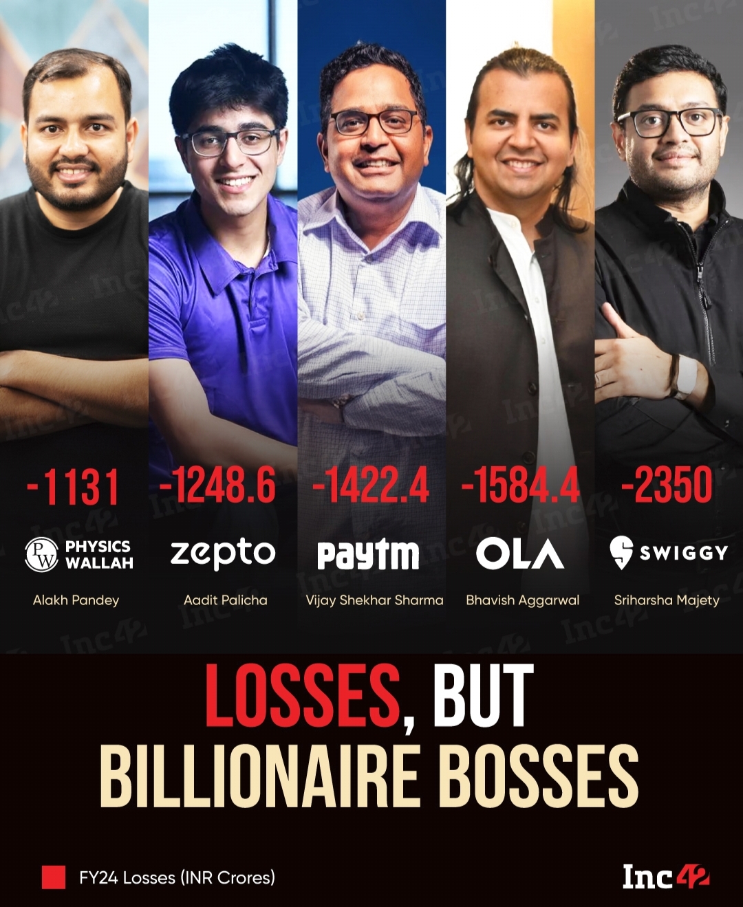 Despite their billionaire status, founders of PhysicsWallah, Swiggy, Zepto, Ola, and Paytm are facing a tough FY24, with their startups deep in the red. For Alakh Pandey, Sriharsha Majety, Aadit Palicha, Bhavish Aggarwal, and Vijay Shekhar Sharma, th