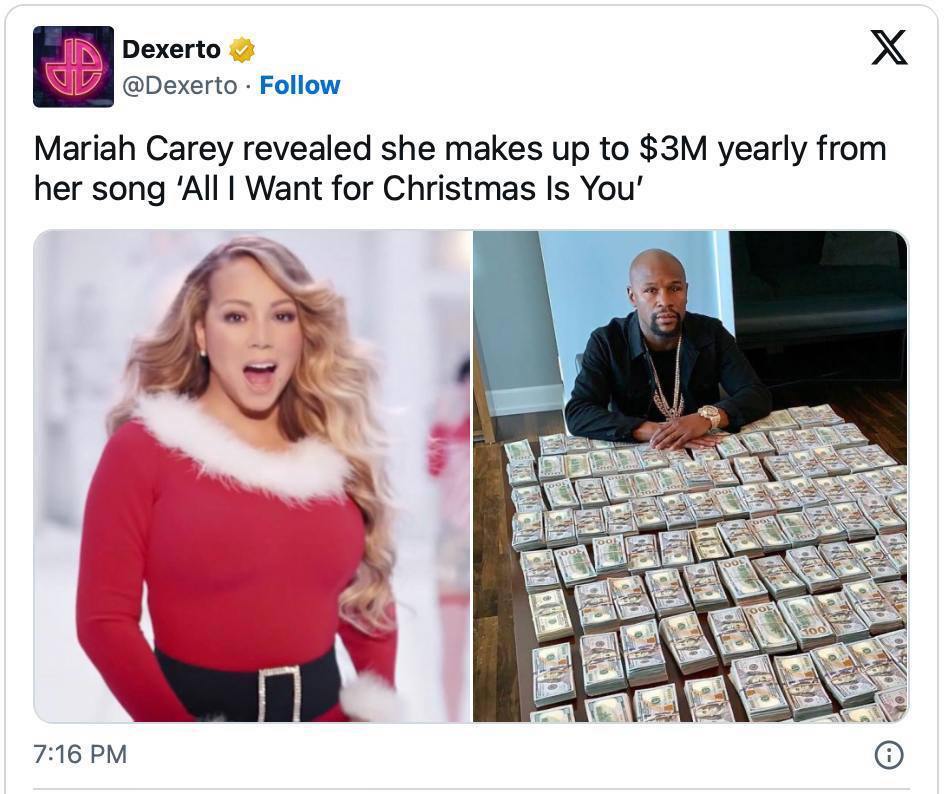 ๐ฃ The season is here: Mariah Carey earns $3M annually from her Christmas hit All I Want for Christmas Is You thanks to streaming. ๐๐ถ Just imagine waking up on January 1st, knowing the New Year brought you a few million dollars. ๐ธโจ