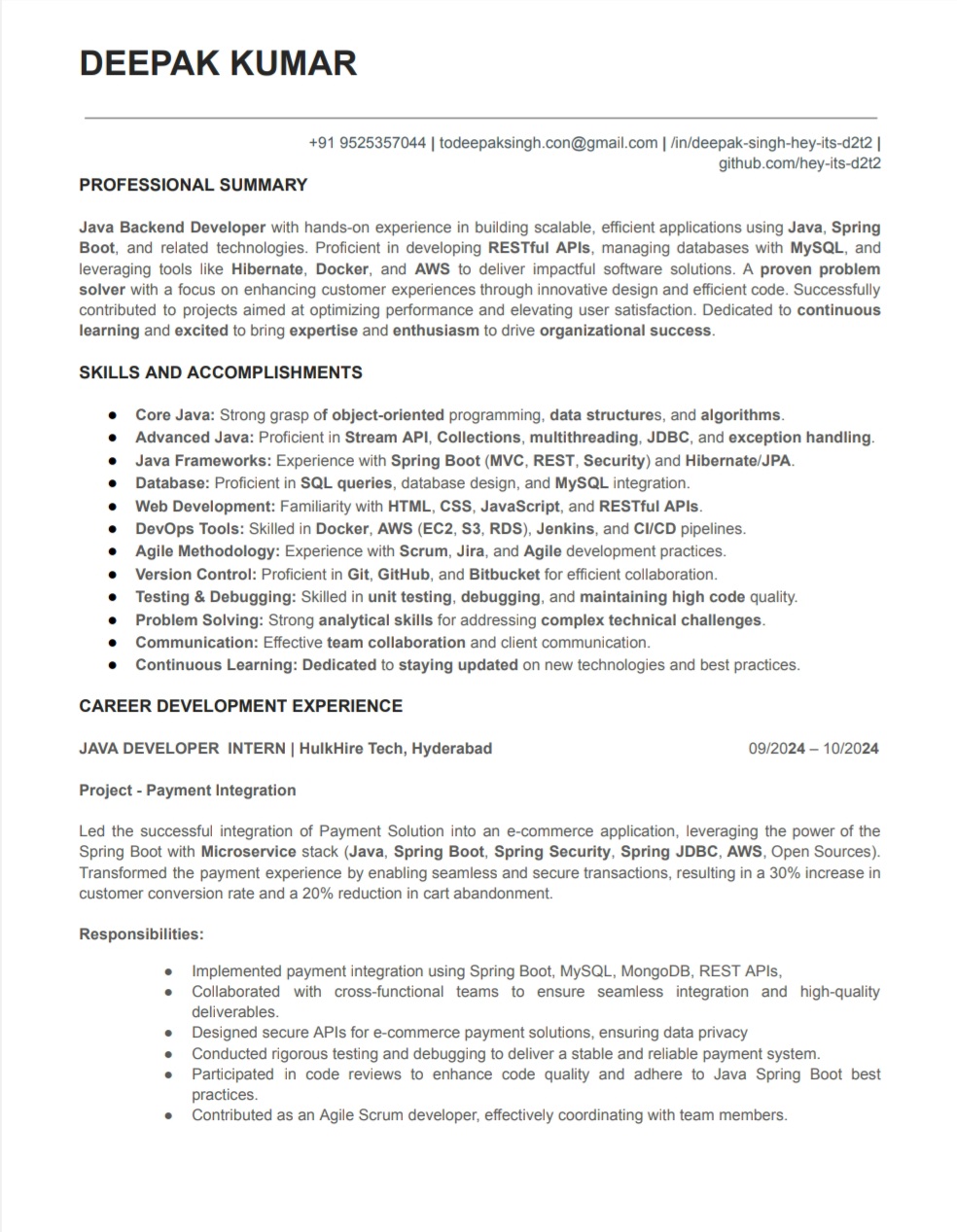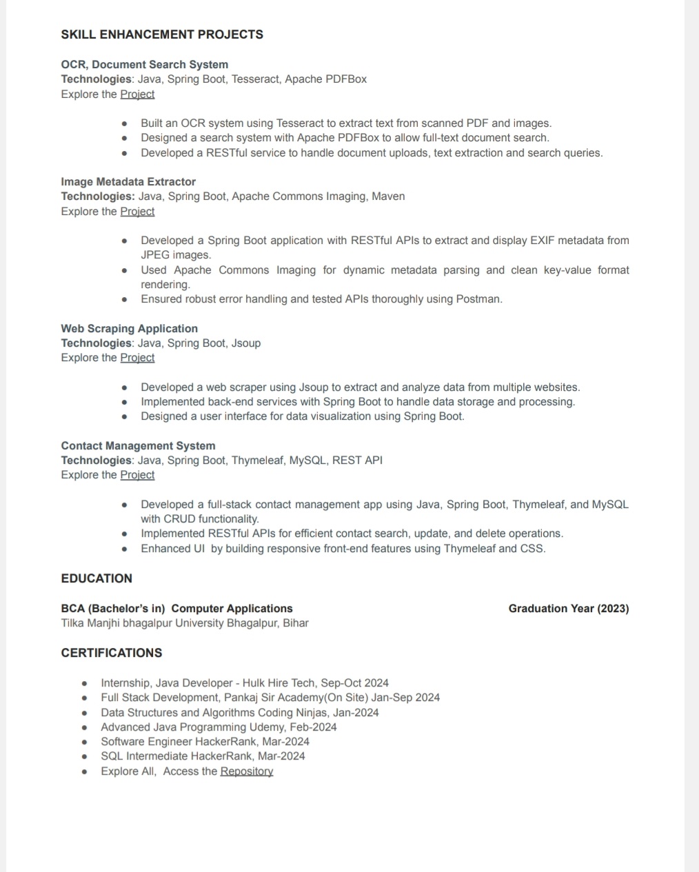 Hi! I’m an experienced Spring Boot Developer with expertise in building scalable microservices, REST APIs, and robust backend systems. Skilled in Java, Spring Framework, Hibernate, and database management (MySQL, MongoDB), I also bring knowledge of DevOps tools like Docker and Kubernetes. With a strong understanding of cloud platforms (AWS, Azure) and Agile methodologies, I’m eager to contribute to impactful projects. Let’s connect to build something amazing together!
