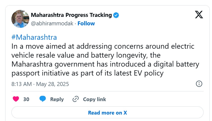 Maharashtra Launches India’s First Digital EV Battery Passport In a pioneering move, the Maharashtra government has rolled out India’s first EV Battery Passport, a digital record tracking battery health, charging cycles, faults, replacements, and ma
