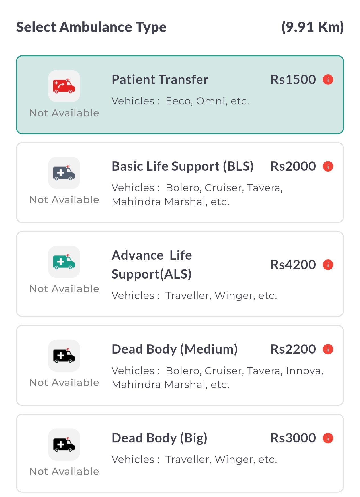 This is an example of an ambulance booking app that charges ₹1500–₹4000 for just 10 km depending on the service type (Patient Transfer, BLS, ALS, etc.). But in my company, the charges will be only ₹500–₹800 for the same 10 km distance. This is the