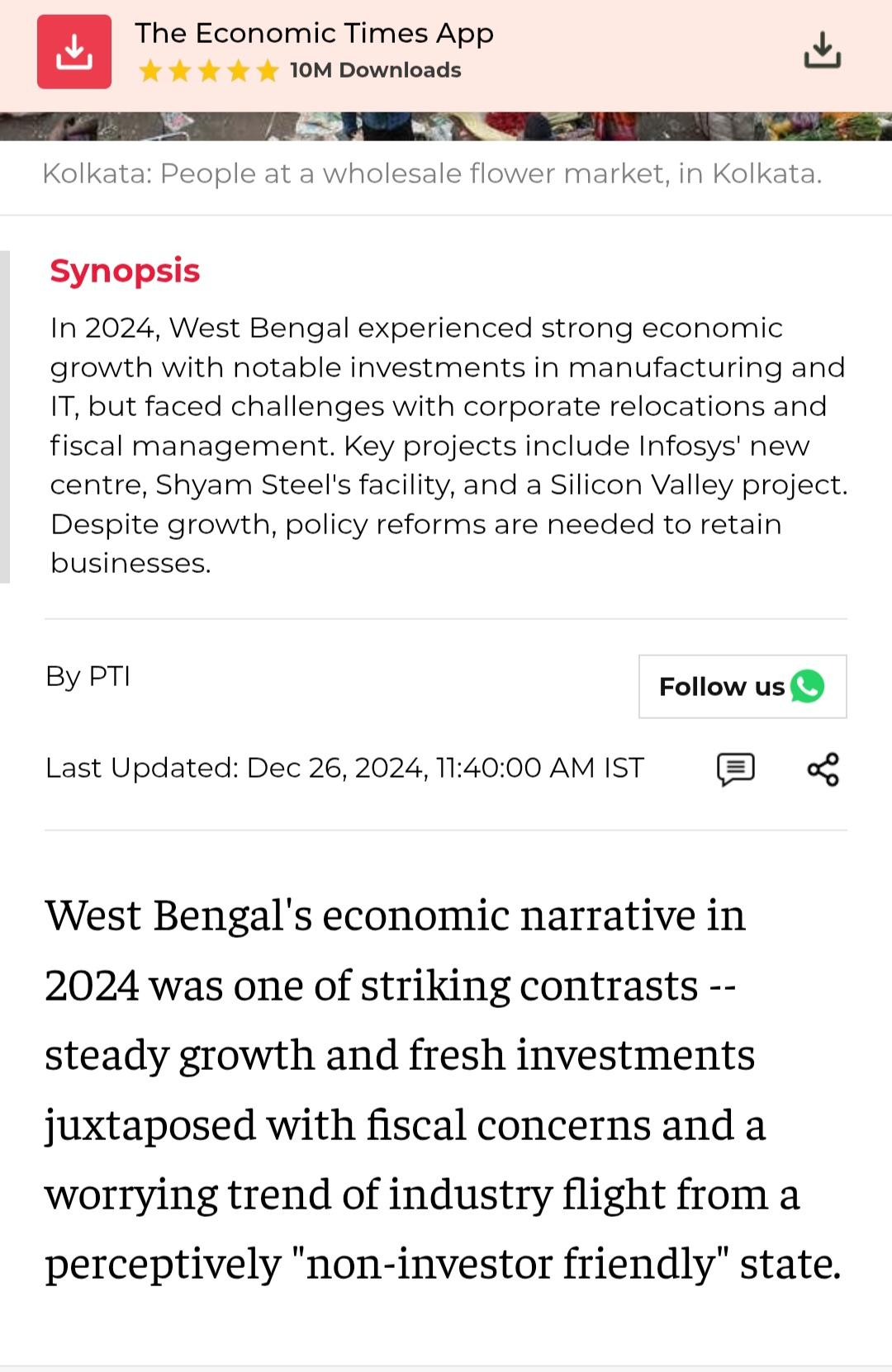 West Bengal has experienced strong economic growth surpassing national average growth rate of 7.32% to grow at 10.5% in 2024-25 fiscal.