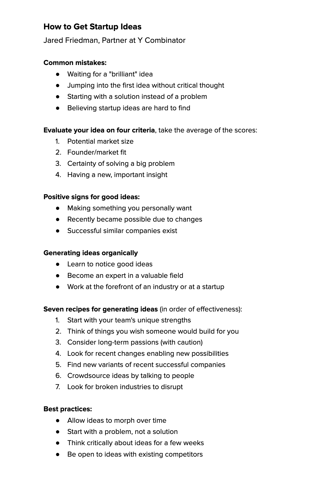 "The very best startup ideas tend to have three things in common: they're something the founders themselves want, that they themselves can build, and that few others realize are worth doing." Paul Graham on how to get startup ideas: https://paulgra