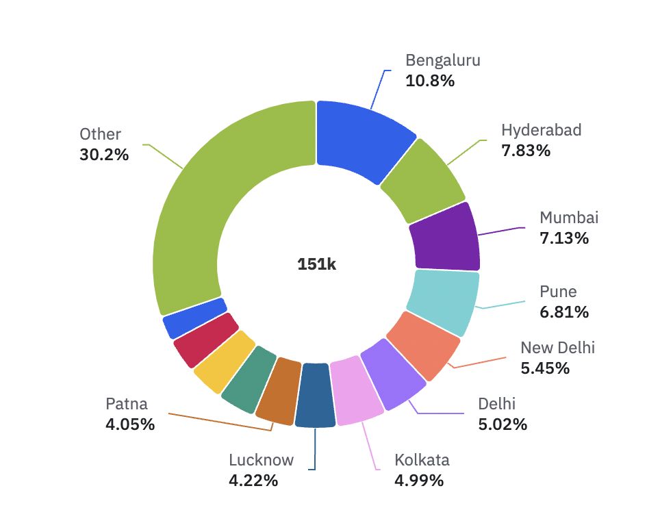 City-wise distribution of Medial Users. This can be related to interest to startup ecosystem as well.