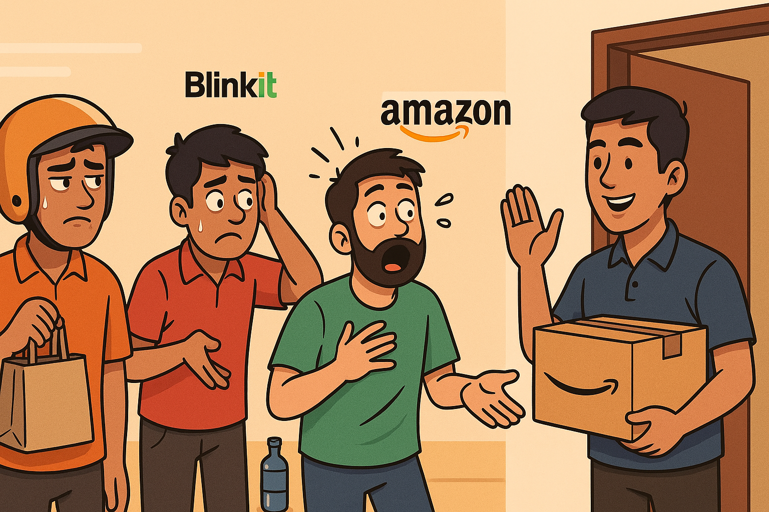 ๐ฅ Amazon delivers in 10 minutes... but rest of India? ๐ค ๐ Swiggy: "Rider picked up your order... then stopped for chai โ." ๐ Zomato: โYour delivery is arriving soonโฆ he's just lost in your colony.โ ๐๏ธ โก Blinkit: โDelivered your shampoo before